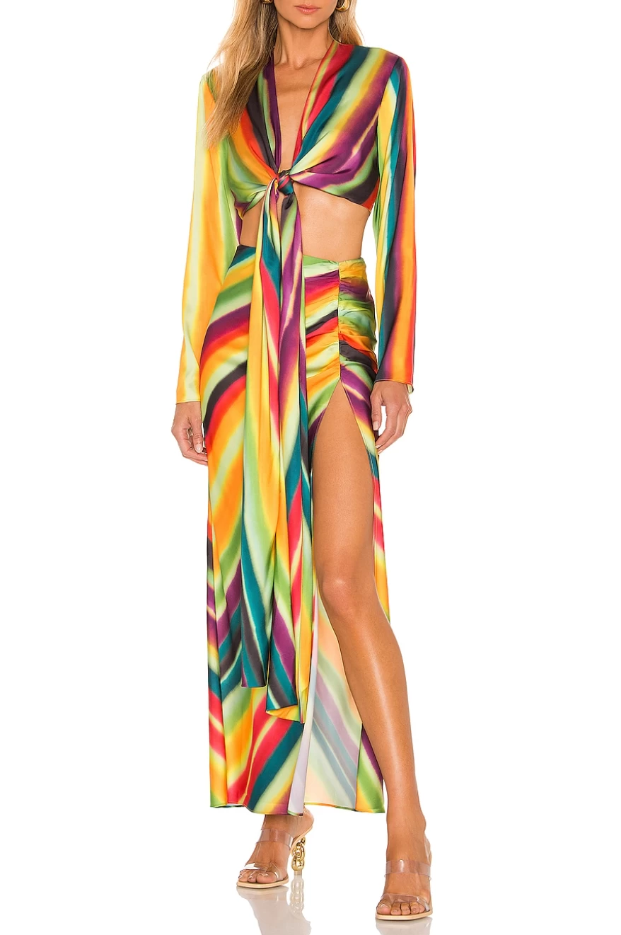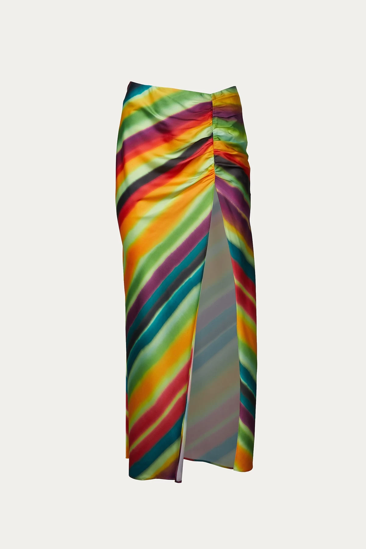 You’ll undoubtedly make the best-dressed list in this multicolored maxi skirt from Ronny Kobo. Colored from hip to hem in a rainbow of stripes, it has been made from lightweight satin with flattering ruching at the hip. Let the thigh-high side slit showcase a pair of barely-there sandals.