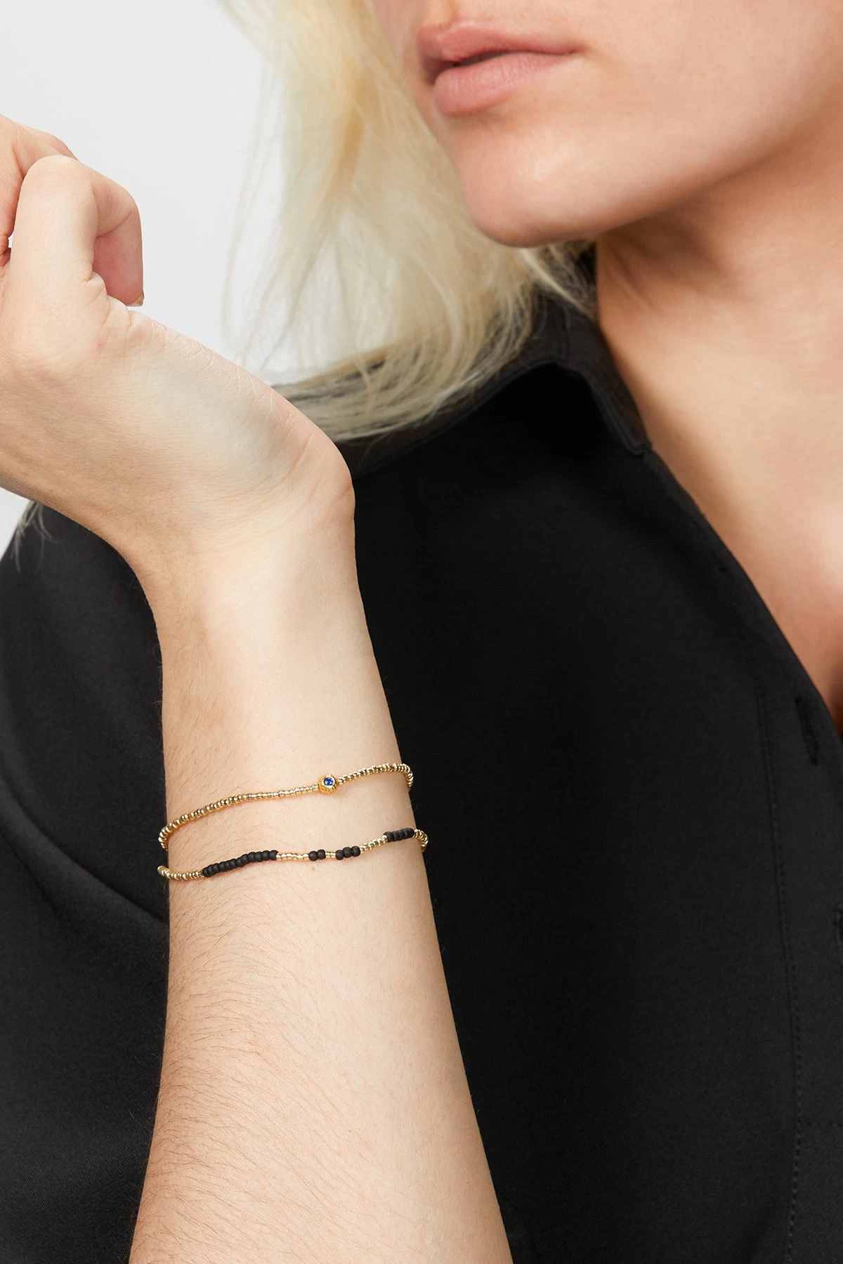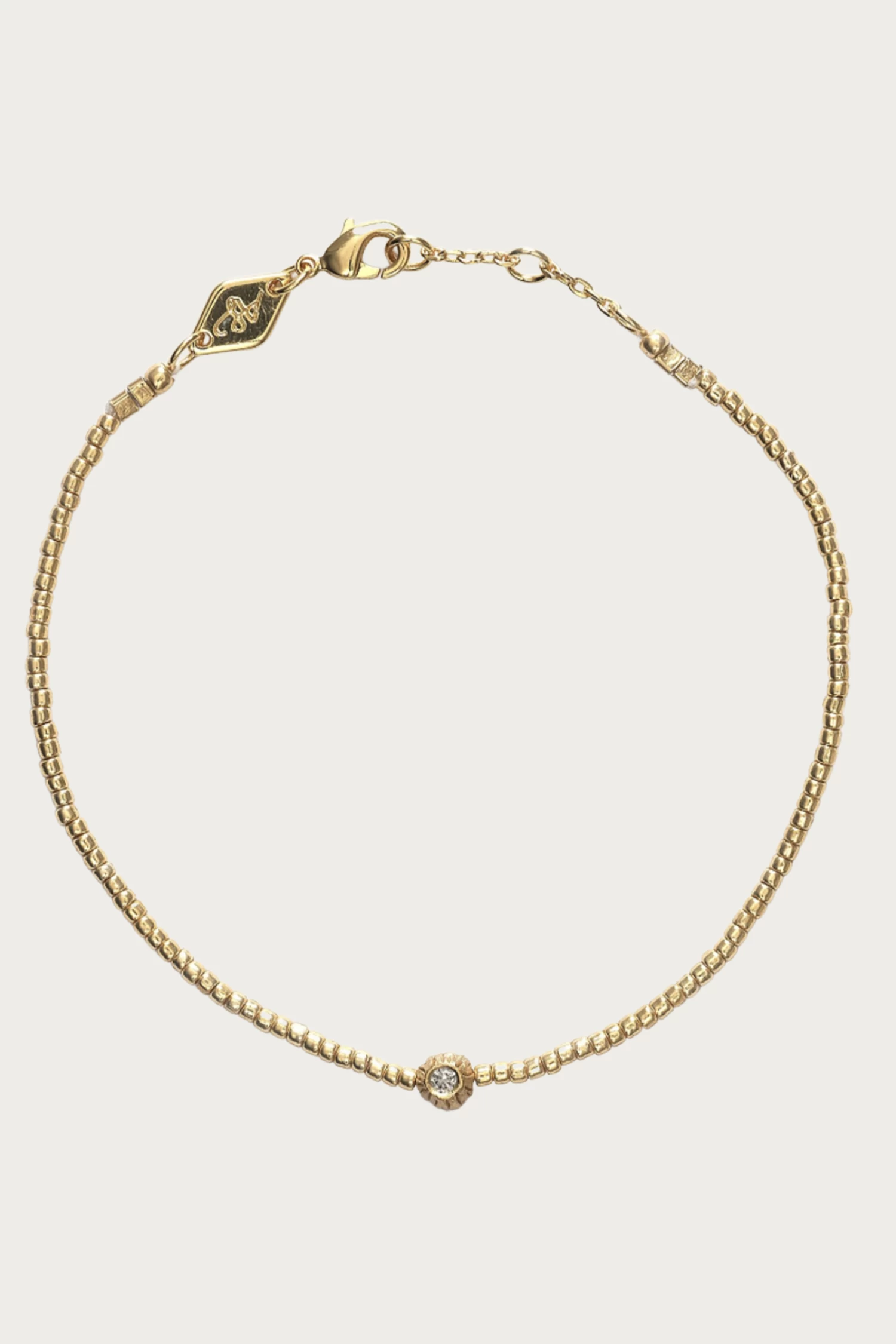 Anni Lu’s jewelry is made by hand with a focus on quality craftsmanship. This dainty ‘Balani’ bracelet is cast from 18K gold-plated brass and features facetted crystals in clear and blue on each side.