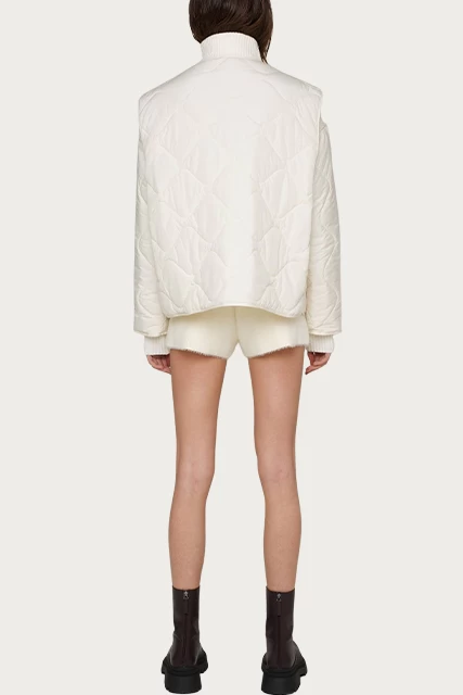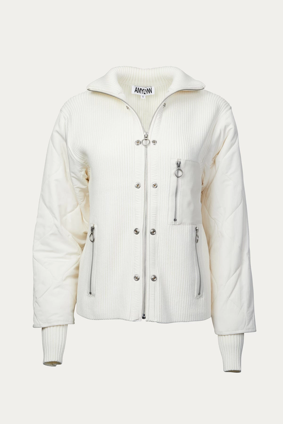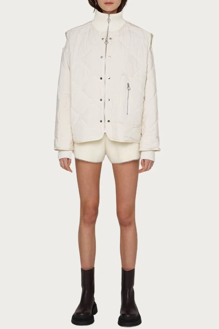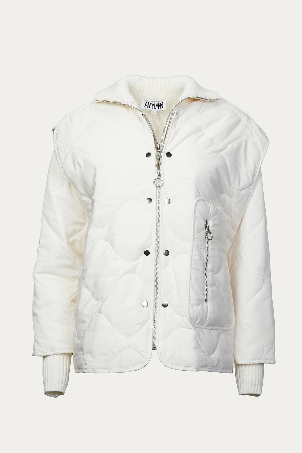 Amy Lynn’s ‘Ash’ jacket ideal for the in-between seasons when it’s not cold enough for a heavy coat. Made from quilted nylon in neutral white, it’s paneled with ribbed-knit at the bodice and has a removable outer shell. It has a functional chest pocket and a collar that can be zipped up to a funnel neck or folded down.Â