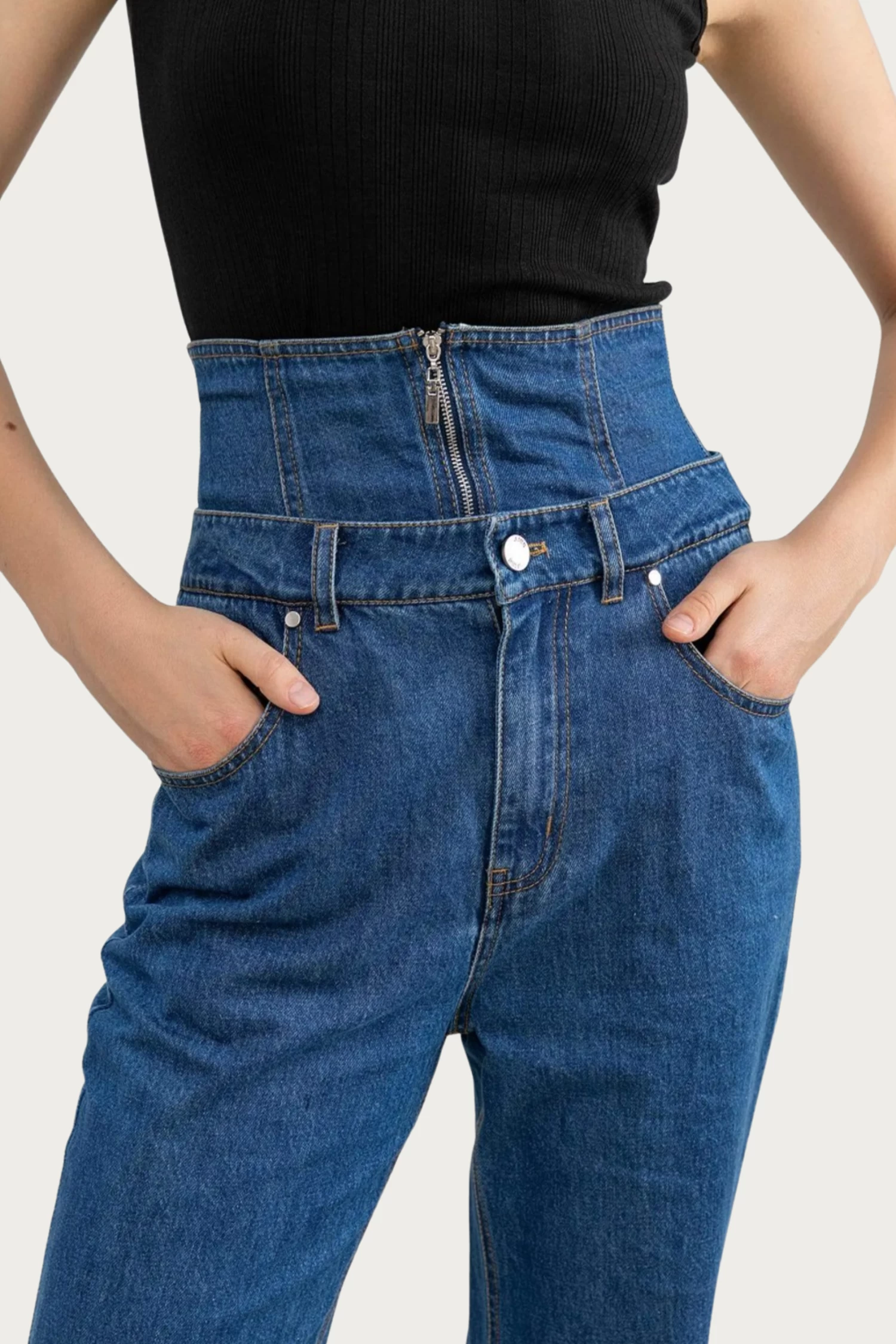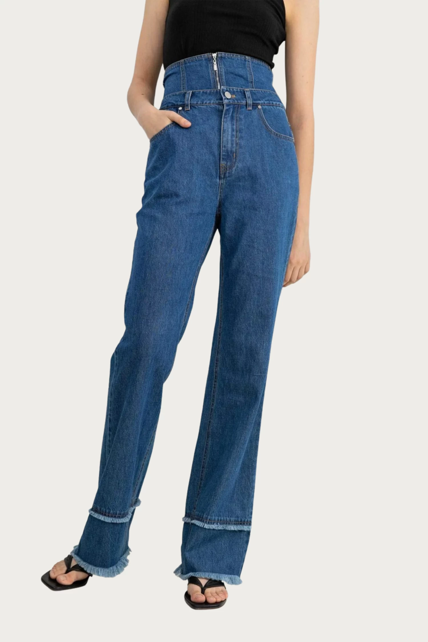 Made with a double waist, J.ING’s jeans are full of individuality. Cut from medium-weight cotton denim, they sit high on your natural waist and fall to straight legs that give the appearance of two pairs layered. Wear yours with bodysuits and tucked-in sweaters.