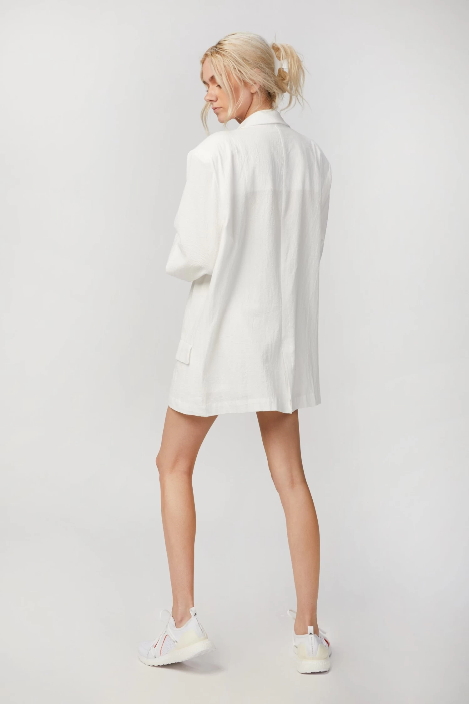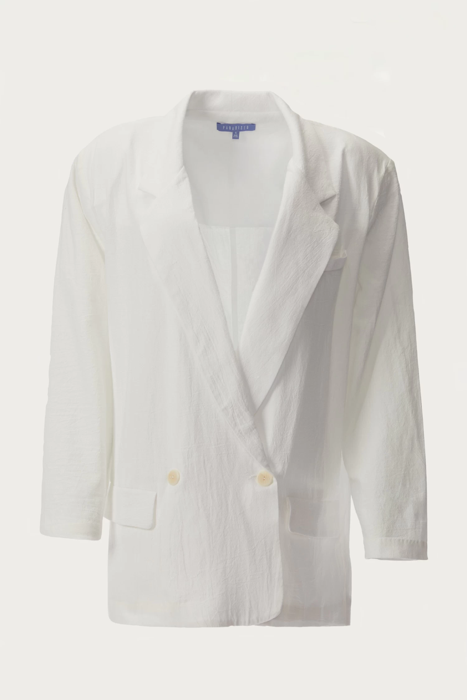 Enjoy the breathability of this lightweight Beach Blazer cut from crinkled cotton gauze. Gauze is thin and lightweight and because of its cotton makeup, it is also breathable. This crisp gauze has been wrinkled, giving the woven an overall tactile hand. Maintain cohesion and pair with the matching Jamie Shorts.
