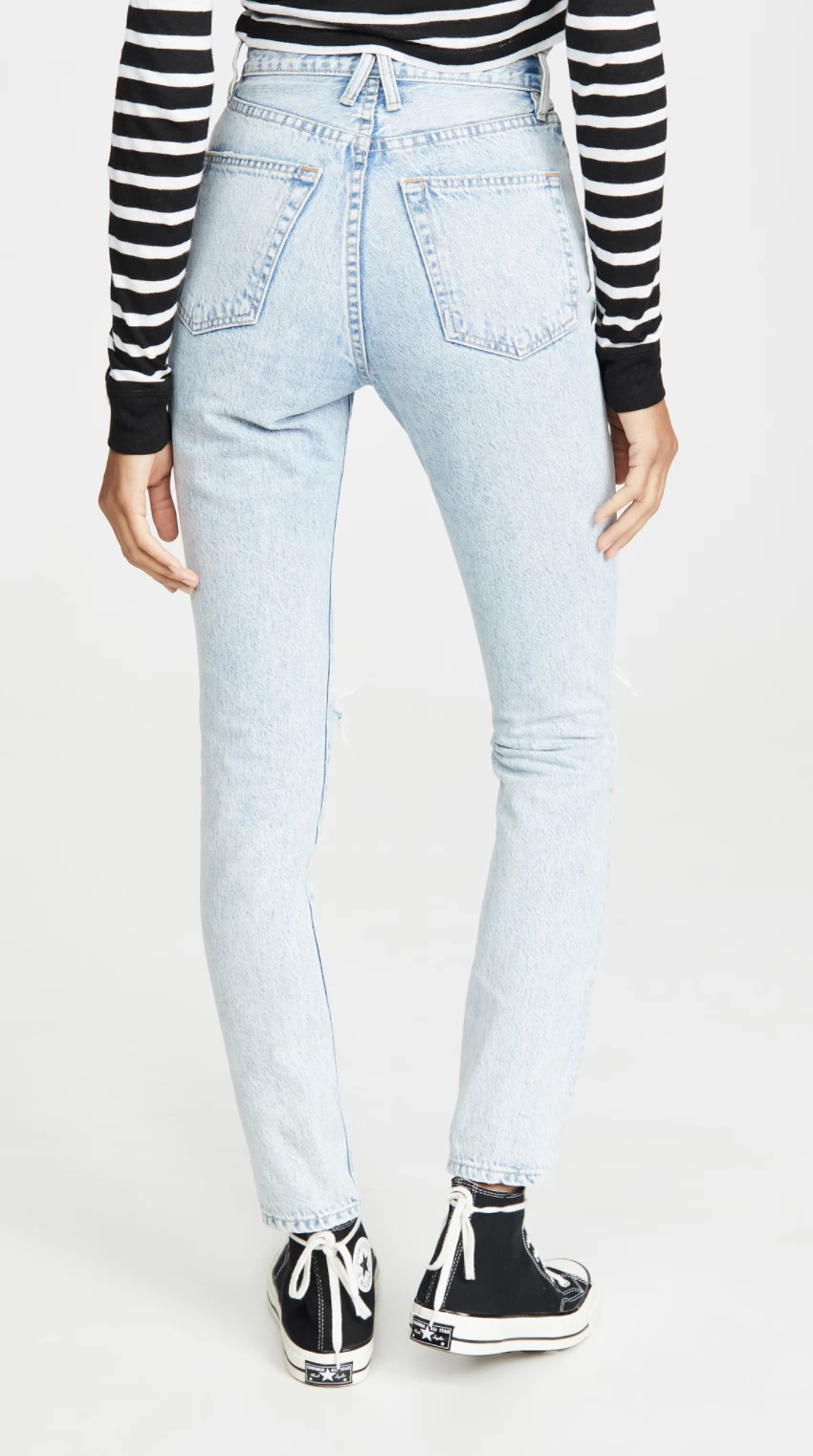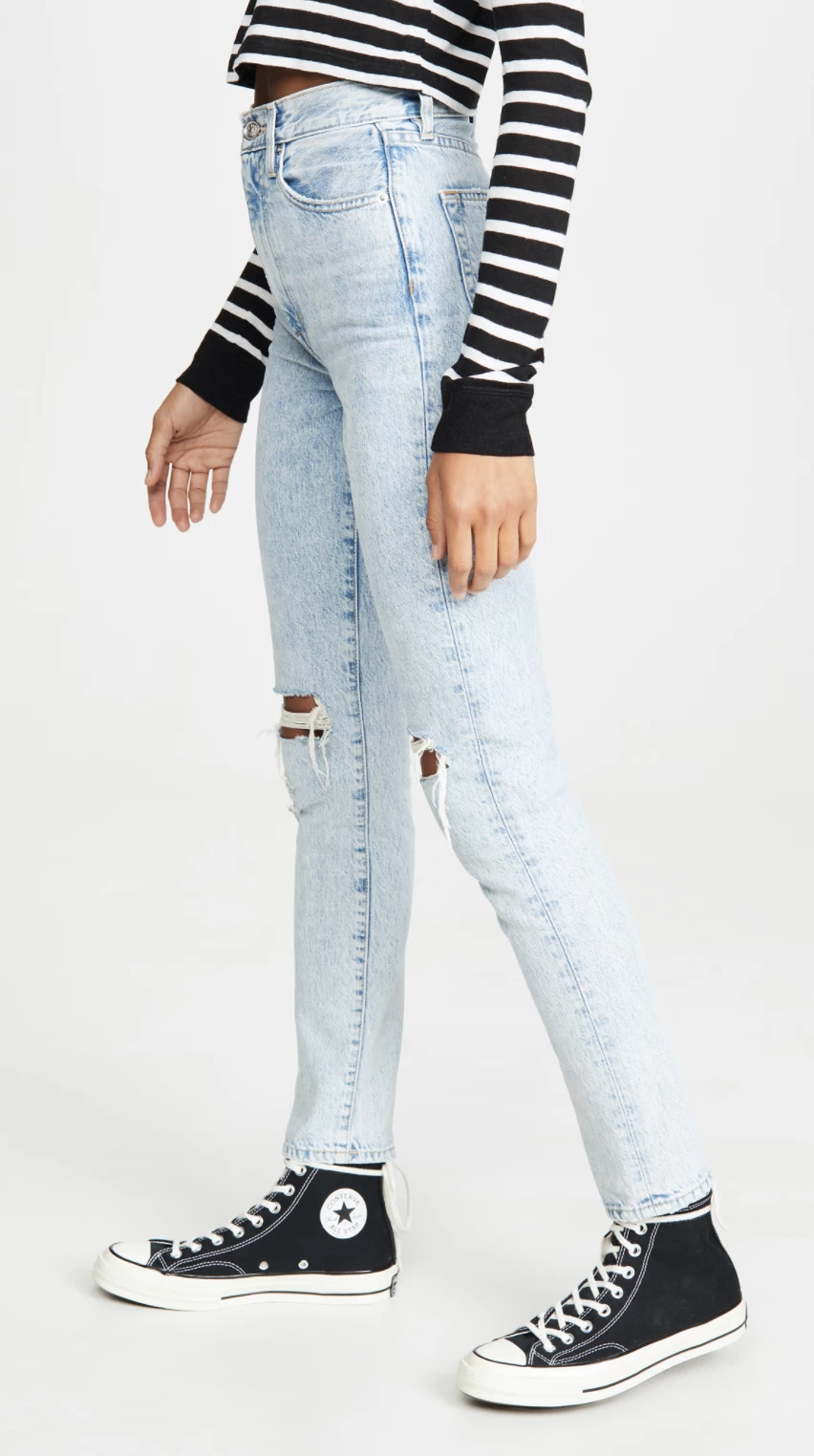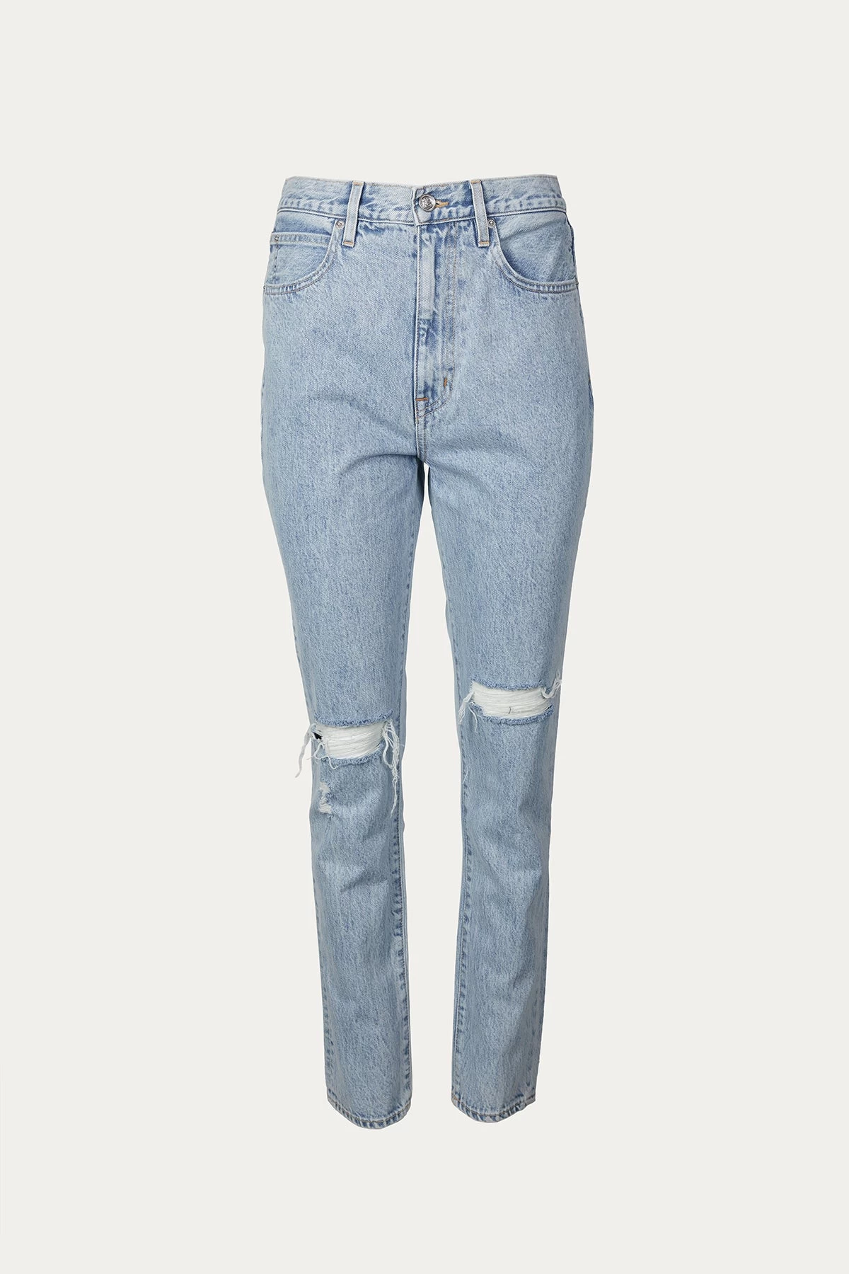 SLVRLAKE uses beautiful quality denim to craft its jeans. Made from distressed light-wash denim, the ‘Beatnik’ jeans are cut to sit high on your waist and have tapered legs. They are made from mid-weight, non-stretchy fabric and are designed for a slim fit. They pair perfectly with sneakers, ankle boots and mules alike.