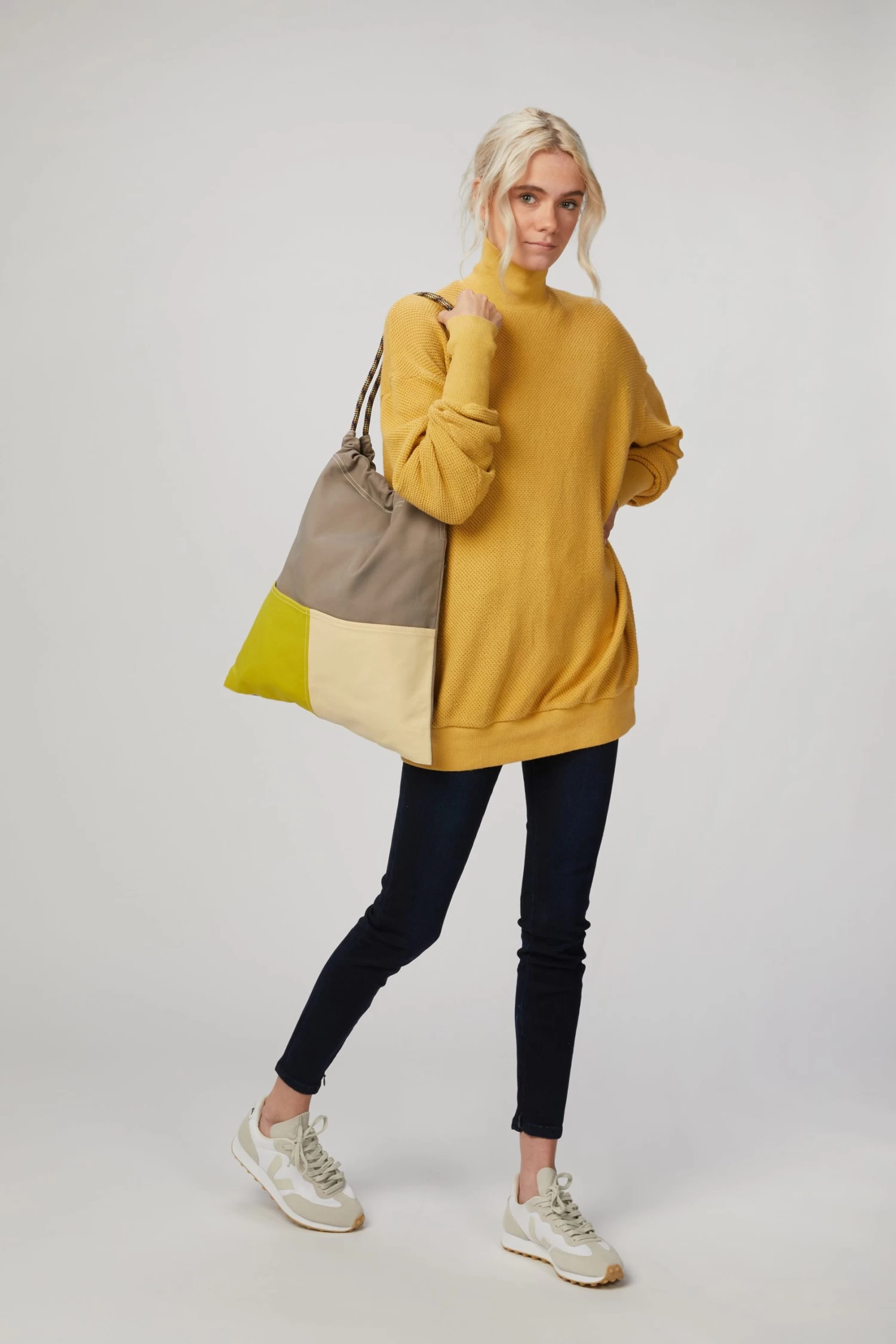 Turtlenecks have been symbols of strength, rebellion, style and modesty throughout history. Feel chic, strong and cozy in this mustard-yellow Bente Sweater. Featuring an oversized fit, this pique sweater has a high neck collar and extra long sleeve cuffs.