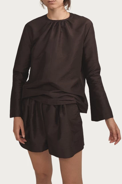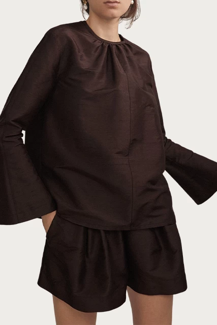 Shaped to a relaxed silhouette, WORN’s ‘Blanche’ shorts are a comfortable choice for summer days. Made from luxurious silk dupion, they have gentle pleats at the front and a gathered, high-rise waist with side pockets. Style yours with the label’s ‘Eulalie’ blouse for a clean look.