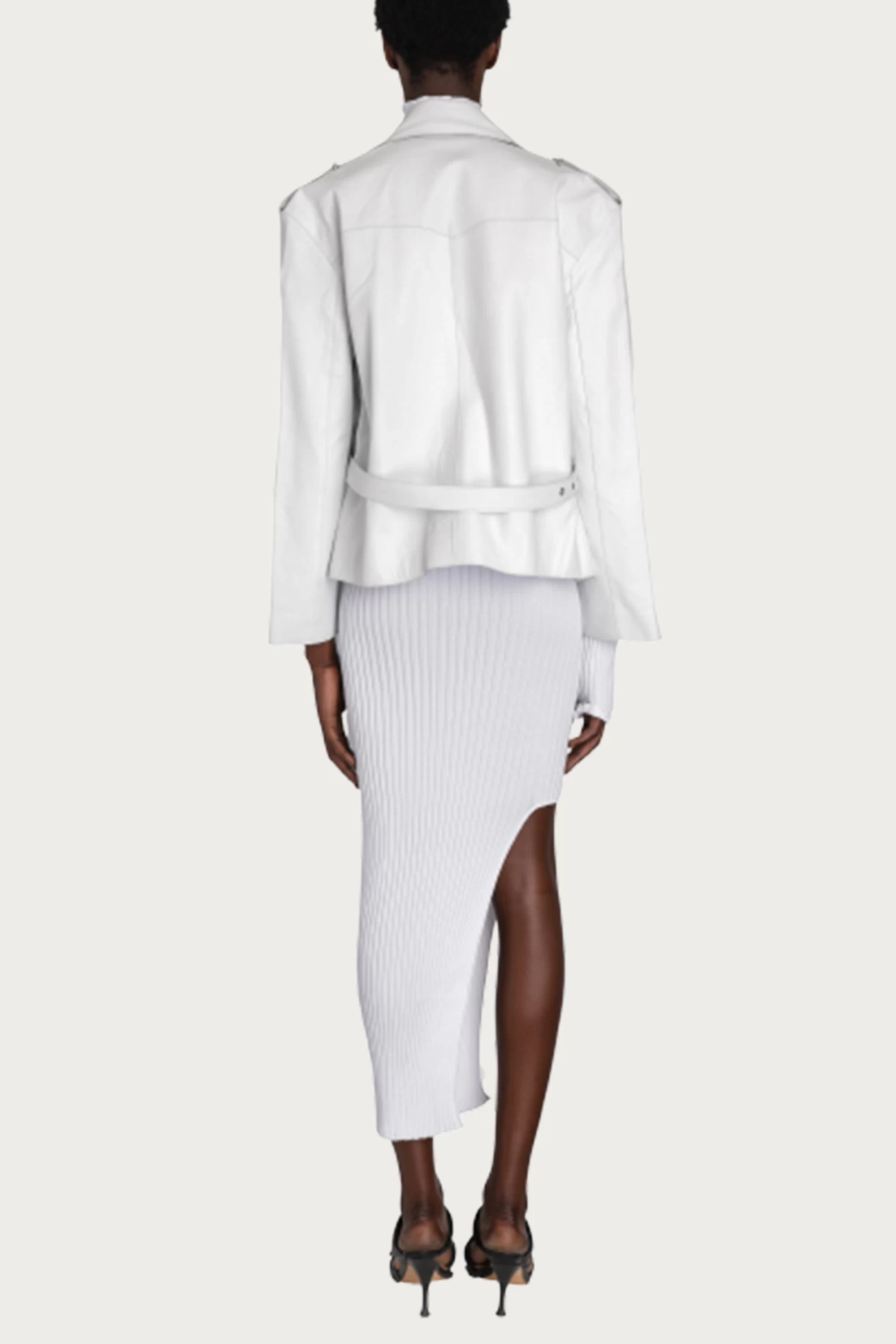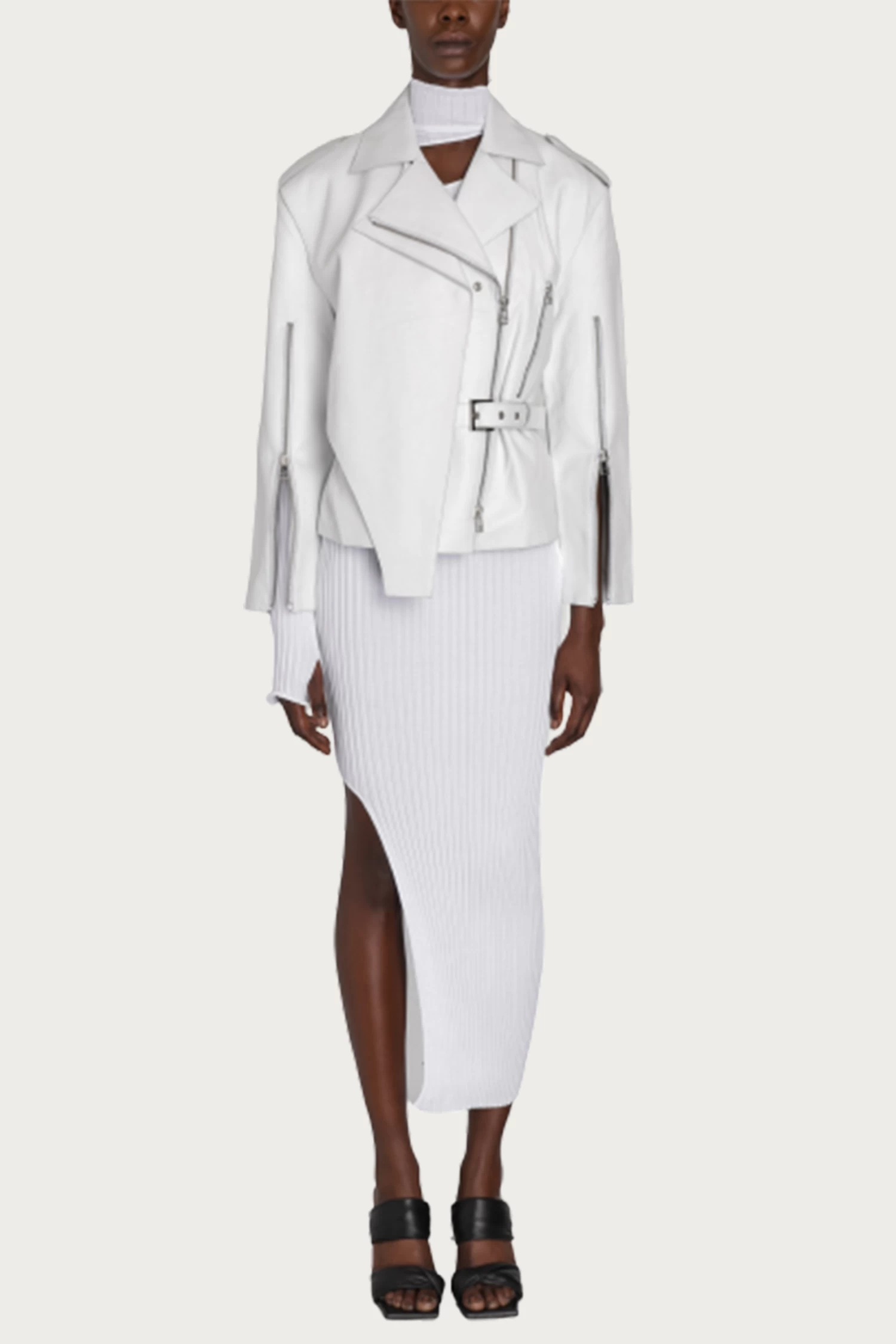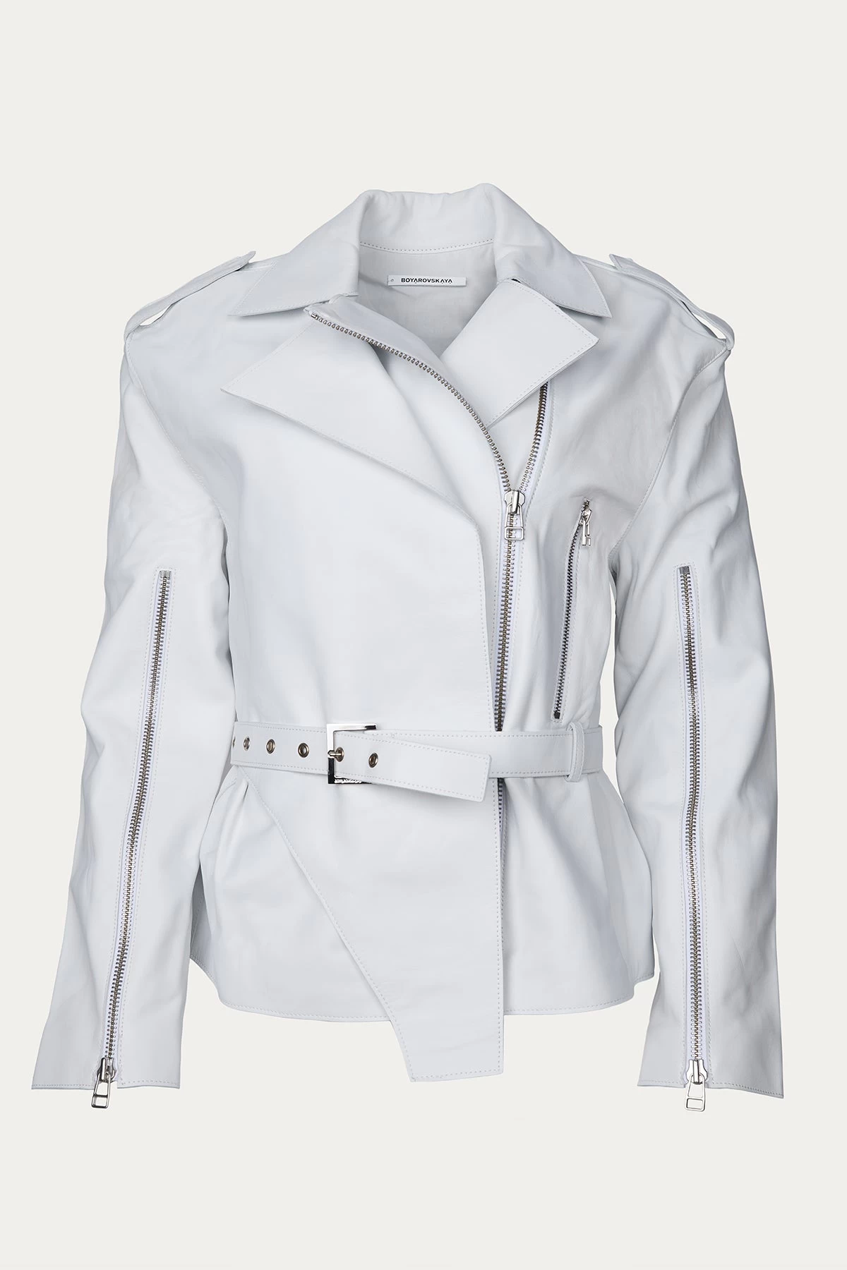 There’s always a subversive twist to Boyarovskaya’s designs, especially when it comes to basics like this ‘Body Cowl’ leather jacket. Made in Italy, it has a classic biker silhouette with a paneled overlay with a buckled waist belt. Wear yours with one of the label’s dresses.