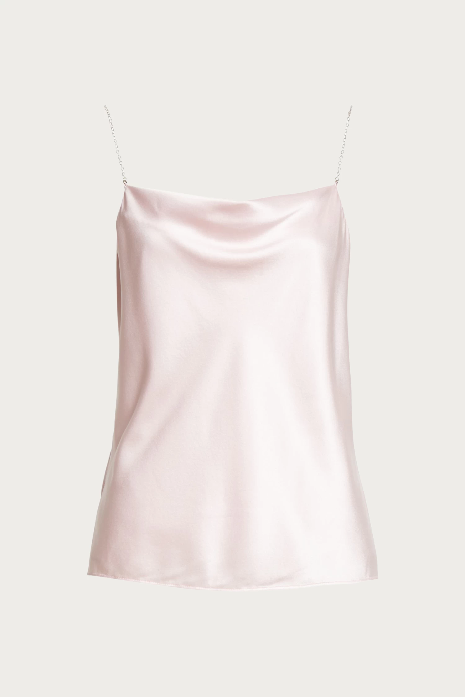 Made of lustrous stretch-silk, Cami NYC’s ‘Busy’ camisole is updated with dainty heart chain straps. It features a cowl neckline that highlights your décolletage and is finished is a soft pink hue. Wear yours to dress up jeans or to sharpen soft suits.