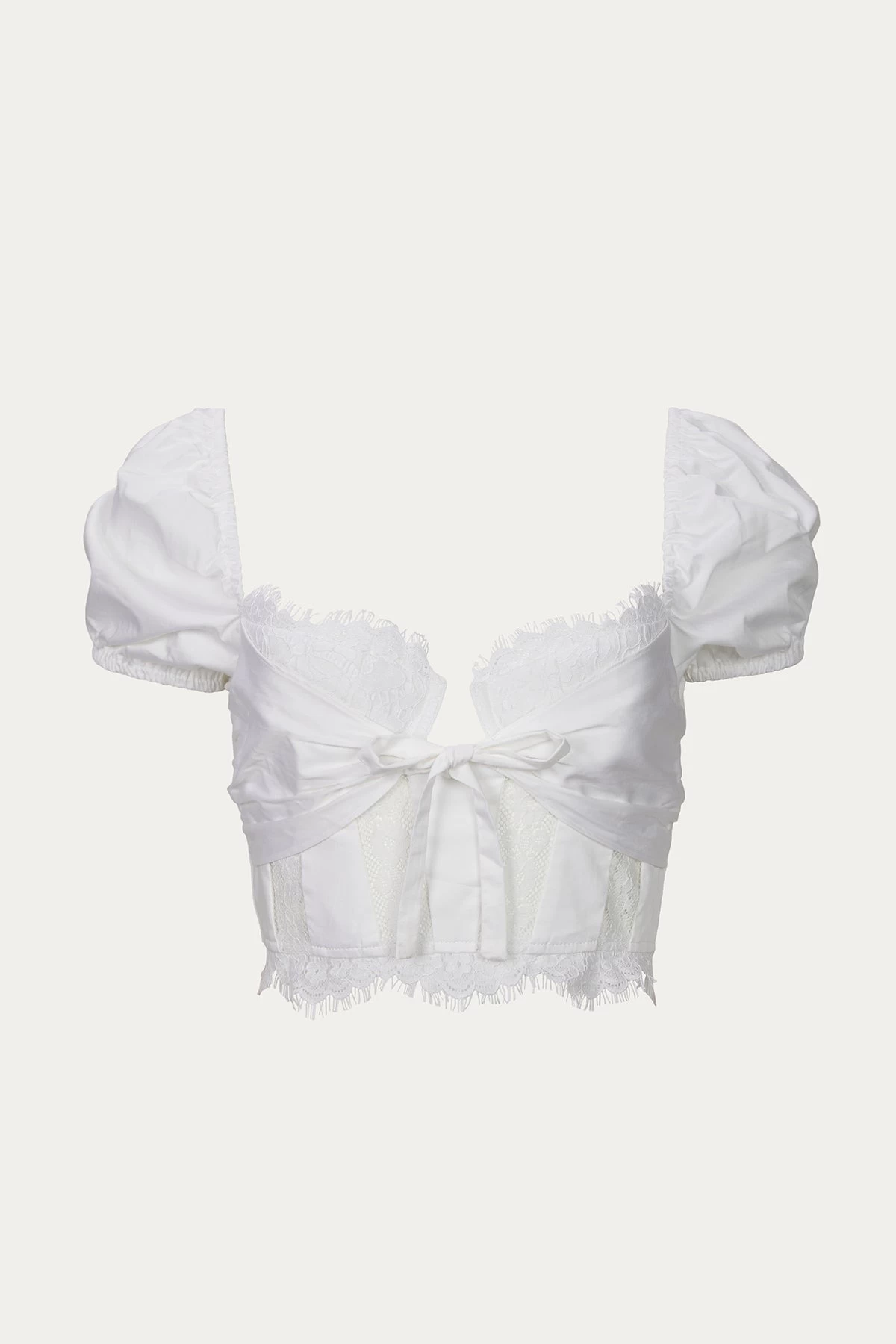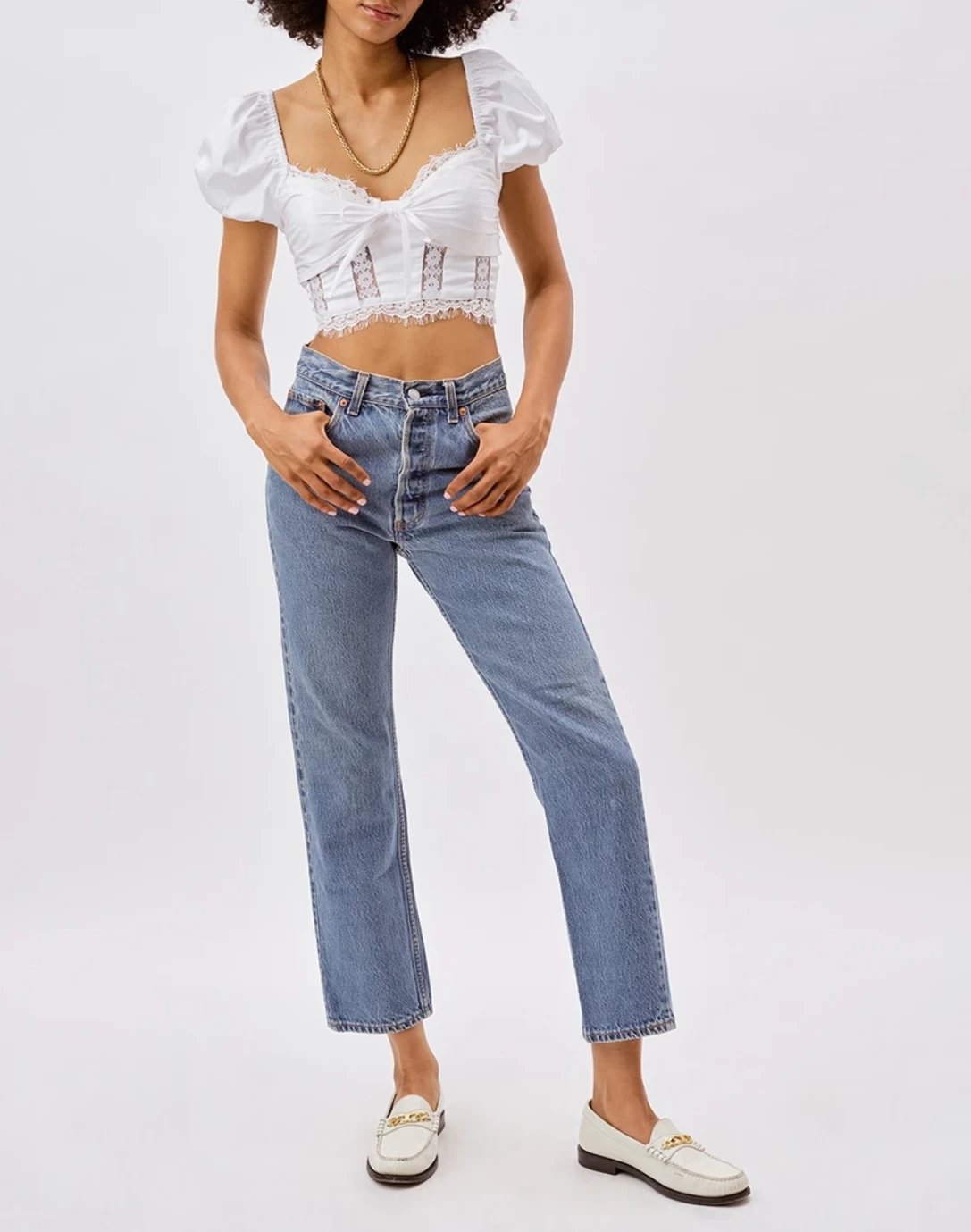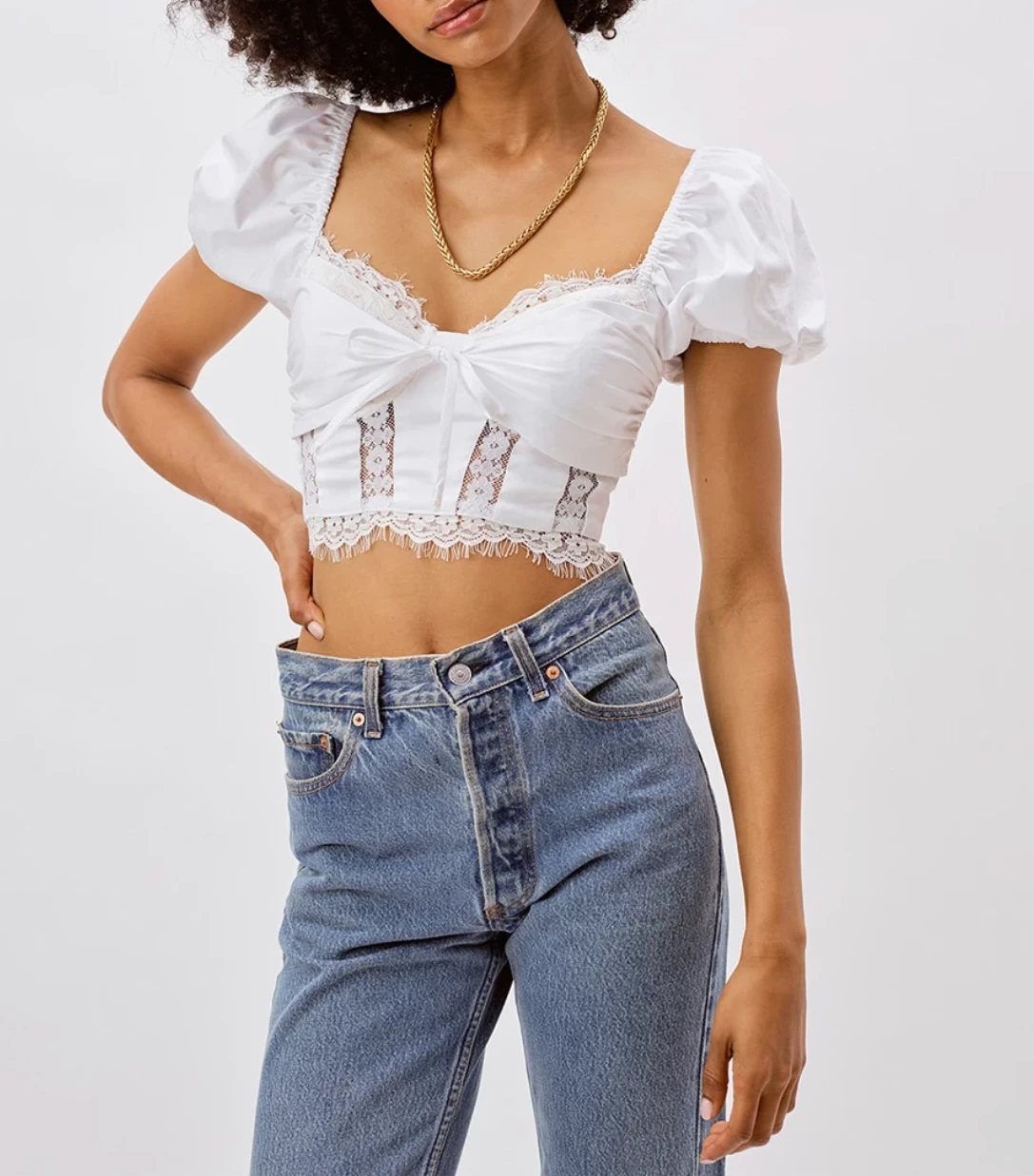 There is nothing more feminine than voluminous sleeves and a sweetheart neckline, and For Love and Lemons’ version will prove invaluable to your summer wardrobe. In lightweight cotton poplin, the style has underwire cups and a ruched bust that overlays pretty floral lace. It is partially lined with an exposed zipper on the smocked back. Complement the cropped hem with high-rise shorts and sandals.
