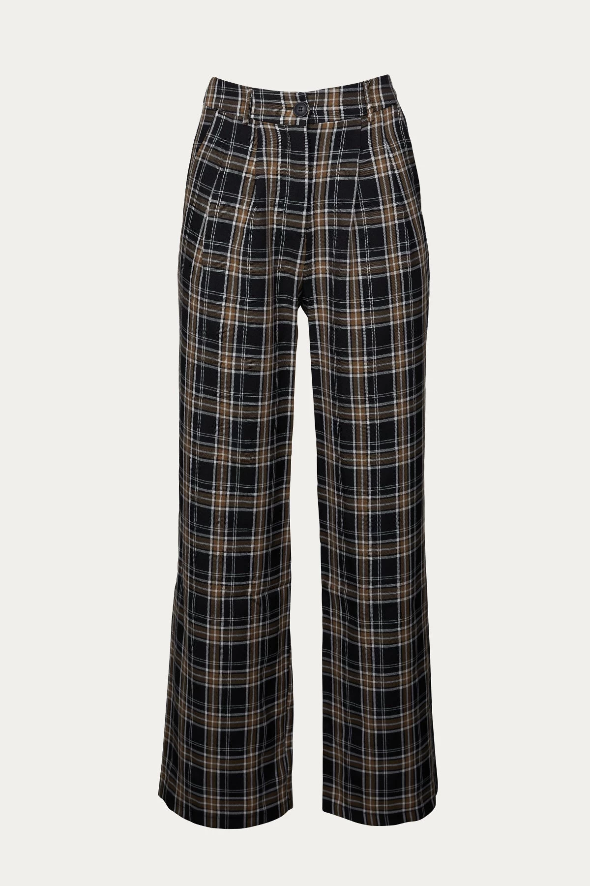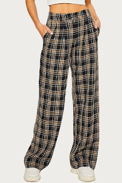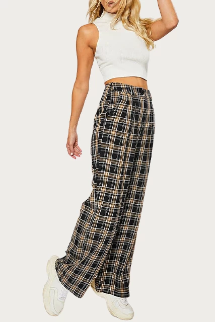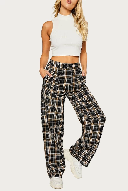 Pretty Garbage’s pants are tailored from lightweight, cotton-blend twill in a checked pattern in neutral black and brown hues. They are designed with a high-rise waist and have fluid, wide legs. Wear yours with a bodysuit and sneakers.