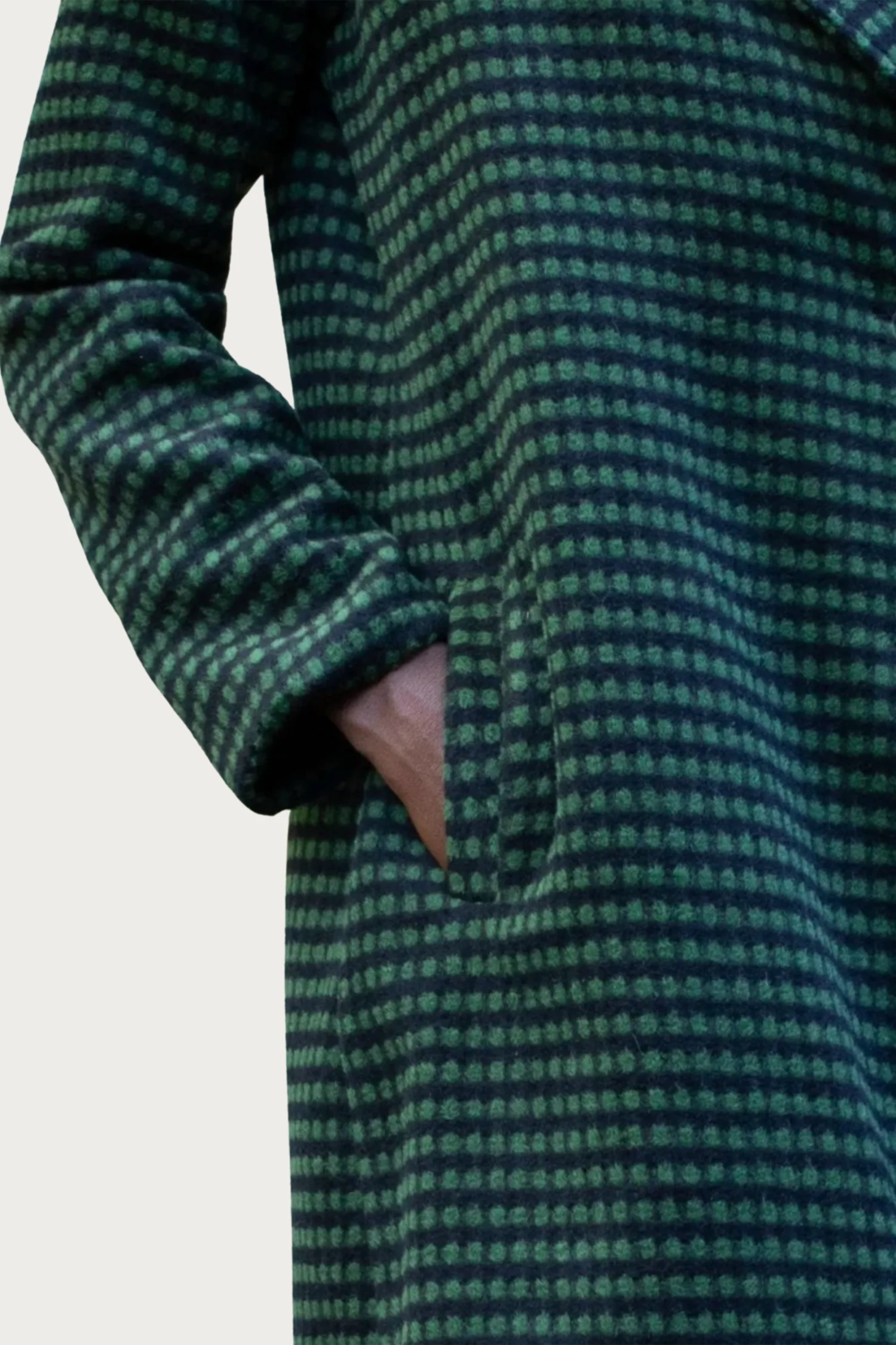 Eva Franco’s coat is a style you will turn to for years to come. Tailored with navy and green checks, it has a double-breasted silhouette with peak lapels and hits mid-thigh – the longer length ensures more warmth. With full lining, it can layer easily over chunky knits.
