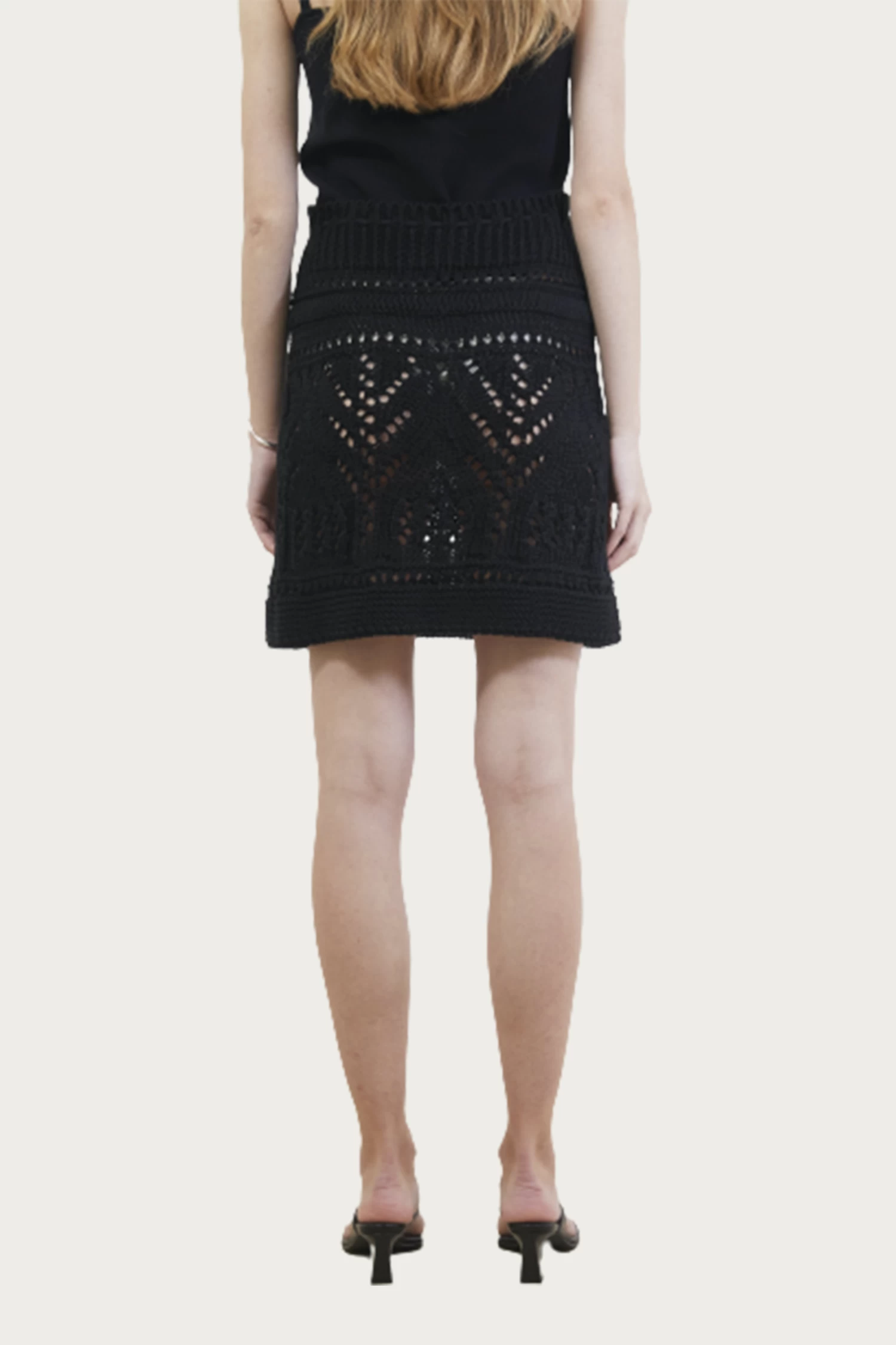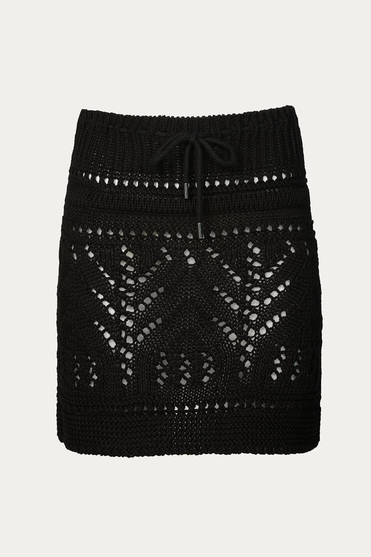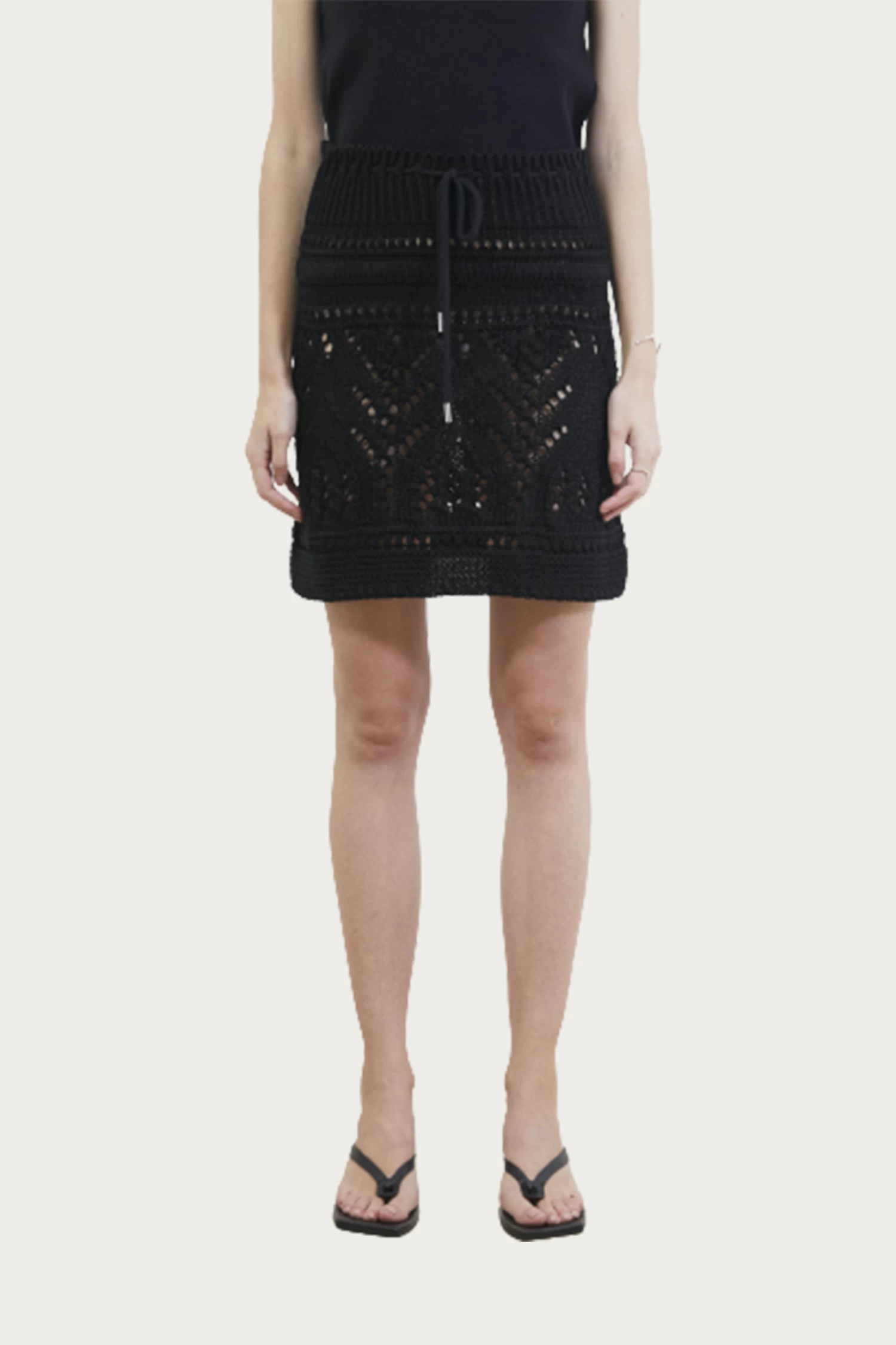 Designer Goen Jong encapsulates romantic yet contemporary attitude to her designs. This crochet knit mini skirt has a rib-knit waistband with a drawstring closure. It is designed to be worn with the matching vest, but looks just as great worn with other separates in your wardrobe.Â