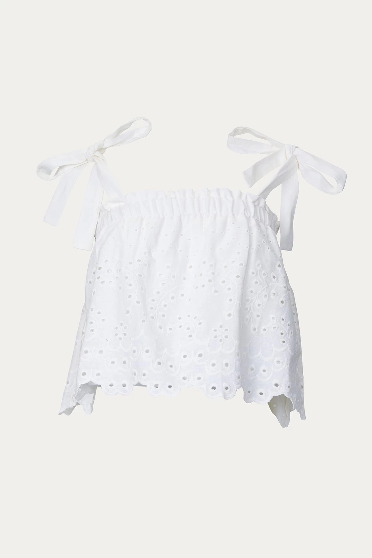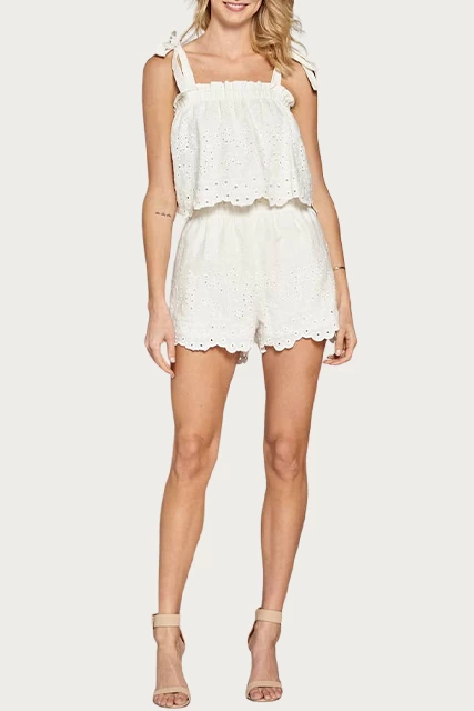Fore Collection’s top is inspired by the notion of endless summers. Made from lightweight broderie anglaise cotton, it has a flowy fit with a scalloped hem and shoulder straps that tie into bows. Style yours with the coordinating shorts and barely-there sandals.Â