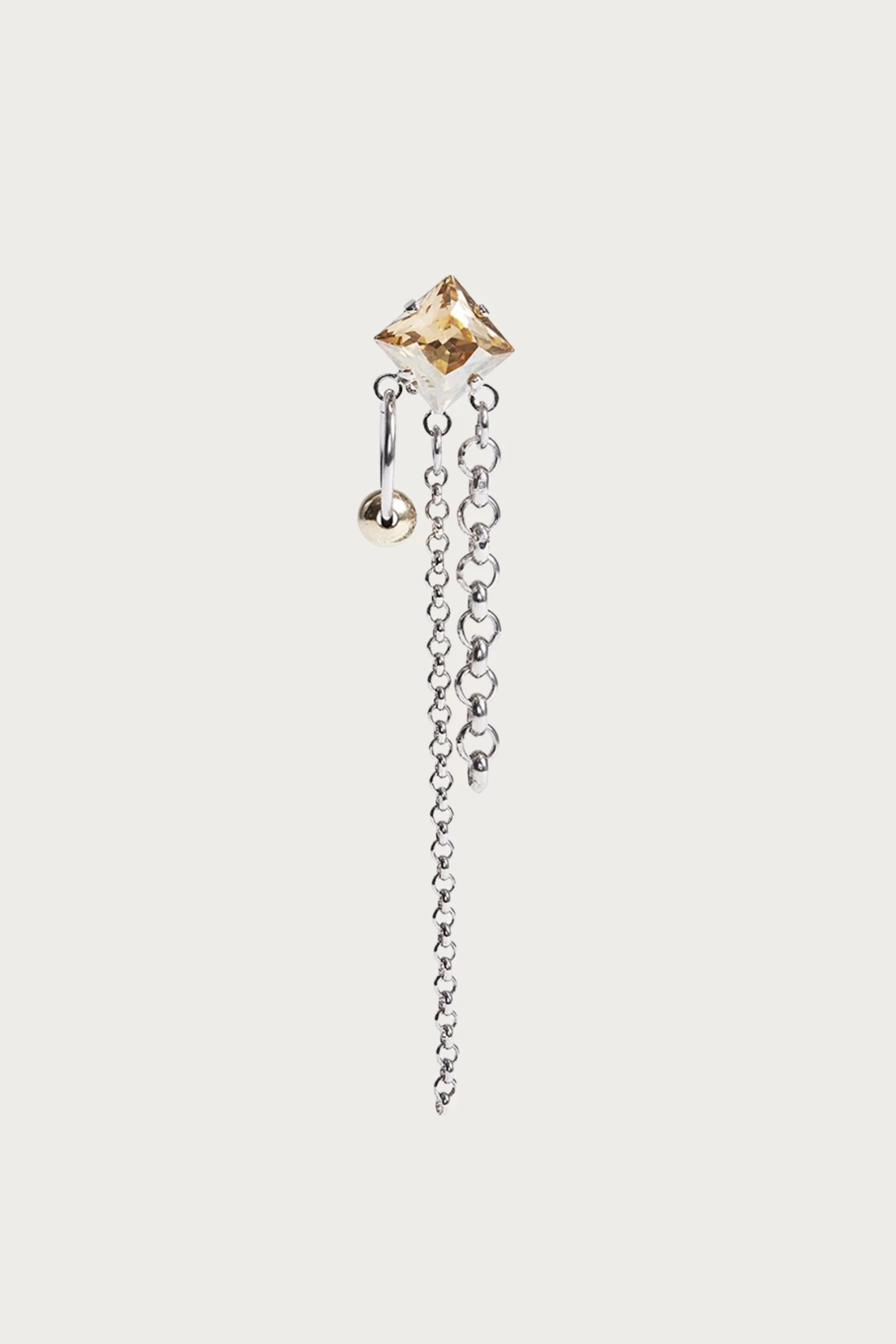 The unique design of the ‘Dean’ earring by Justin Clenquet ensures the label will sit high on your jewelry wishlist. Designed and handmade in France from palladium-plated brass, two varying chains and a small hoop suspend from a golden shadow Swarovski crystal. Sold as a single earring.Â