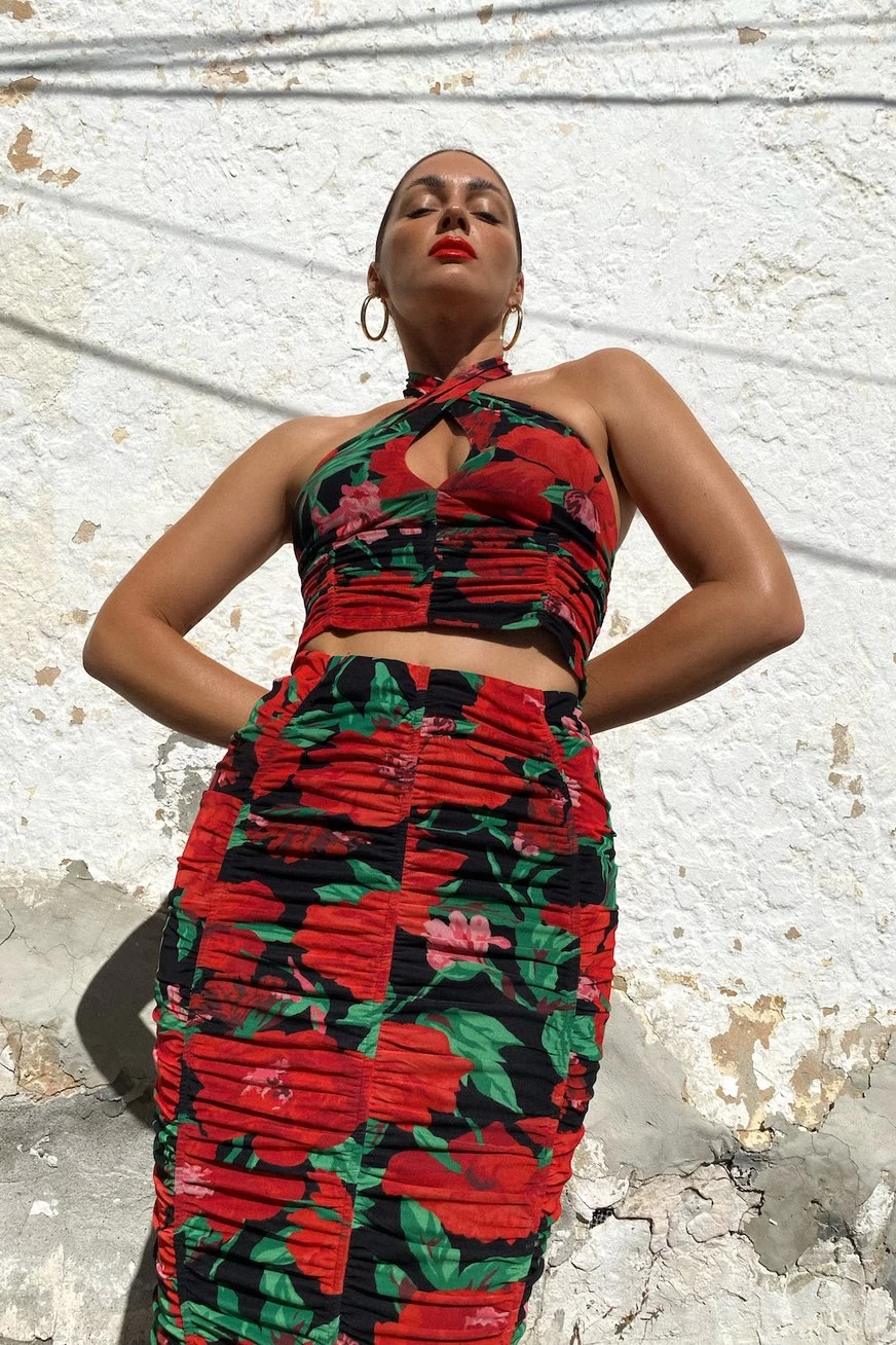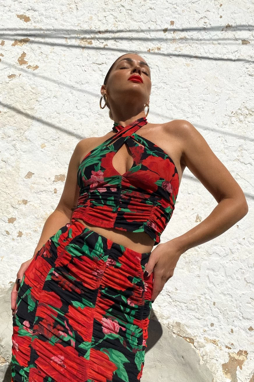 AFRM’s ‘Denver’ top has been made of sheer mesh with a rose motif – giving it such a romantic feel. Fully lined, it features a wrap-neck silhouette with a front cutout and ruched corset-inspired seaming. Style yours with the matching ‘Noha’ skirt in the same print.