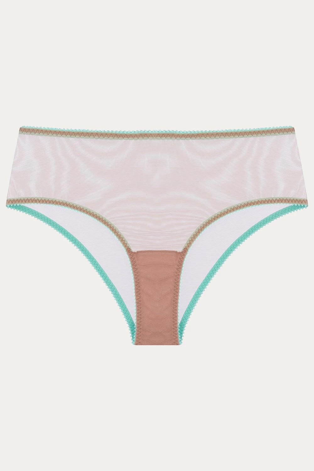 The Juno High Waist Knickers are made from sand stretch-tulle outlined by contrasting lace trims. They have a flattering high-rise waist and mold to the shape of your body for all day comfort. They offer medium coverage at the reverse.