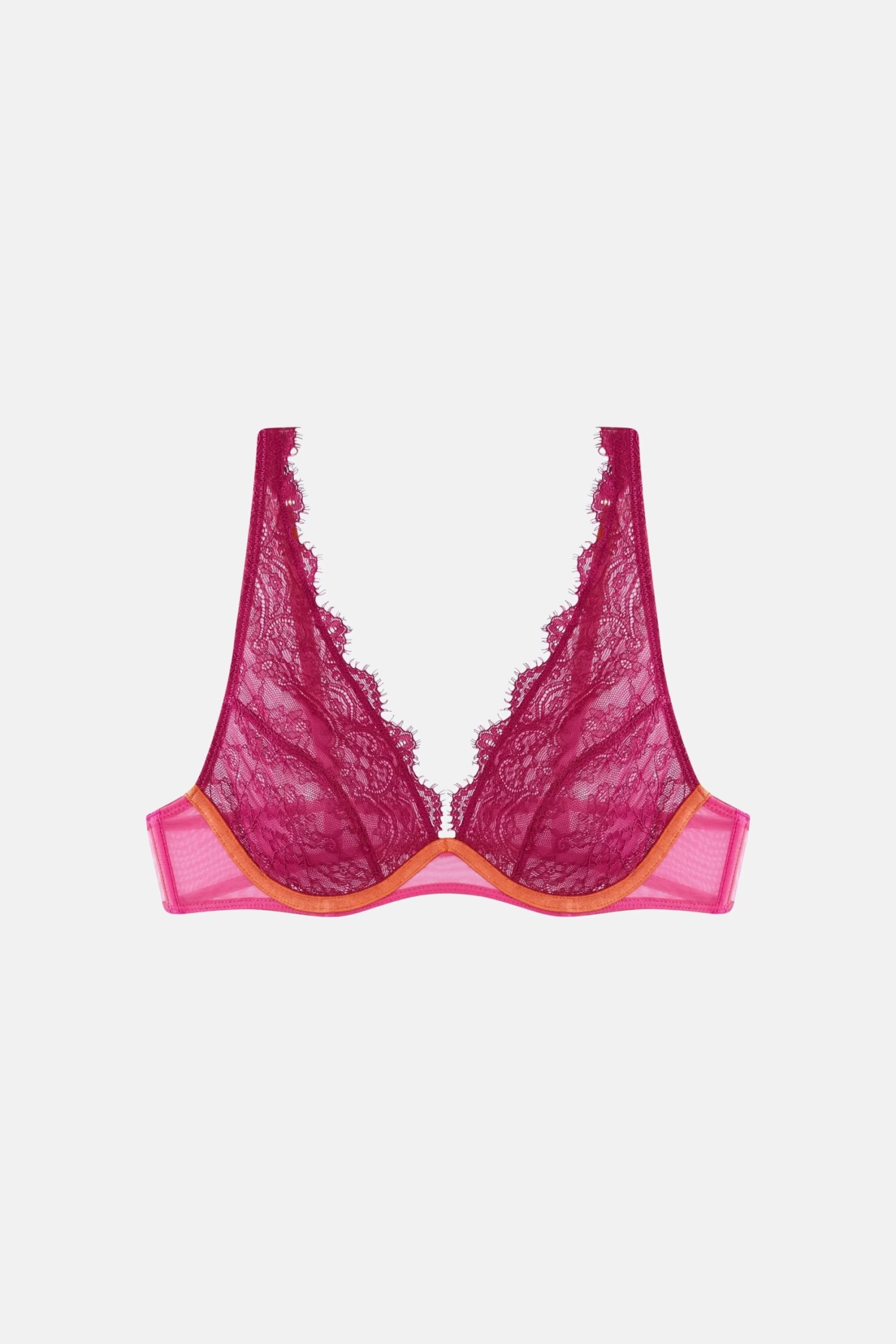 In a lifting high apex cut, Dora Larsen’s ‘Kiran’ high apex underwire bra is made from stretch-lace and has short-underwired cups for ample lift. Free from padding, this design accentuates natural shape without the compromise of support. The plunging-neckline design offers a flattering fit.