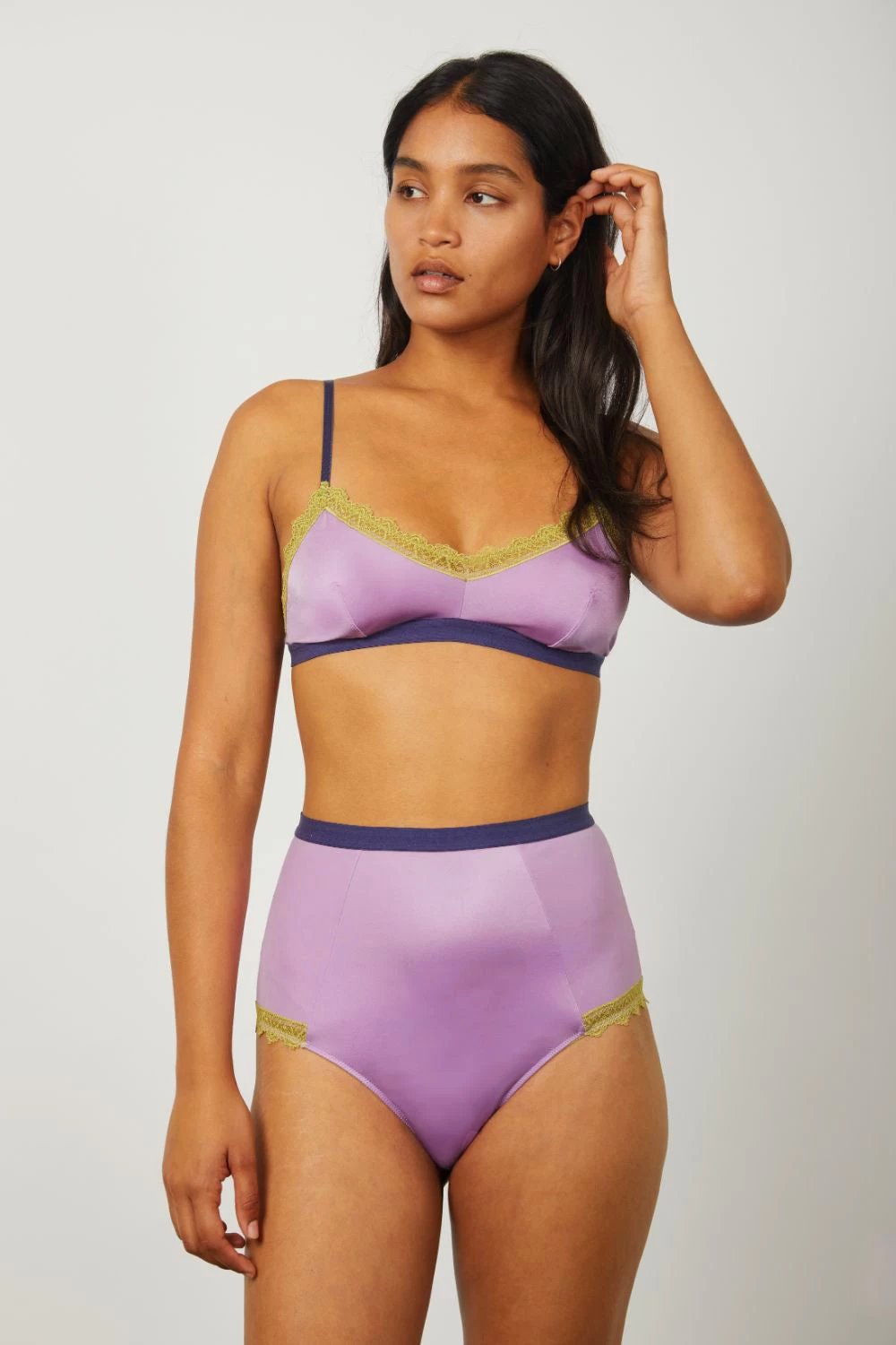The Lily Soft Bra is cut from an orchid, silky microfiber fabric and is as comfortable as it is pretty. Non-padded cups with vertical seaming provide a flattering lift and accentuate a natural shape. Free from wire, find added support from the elastic underband. With a playful color palette, it has navy adjustable straps and moss green trim.