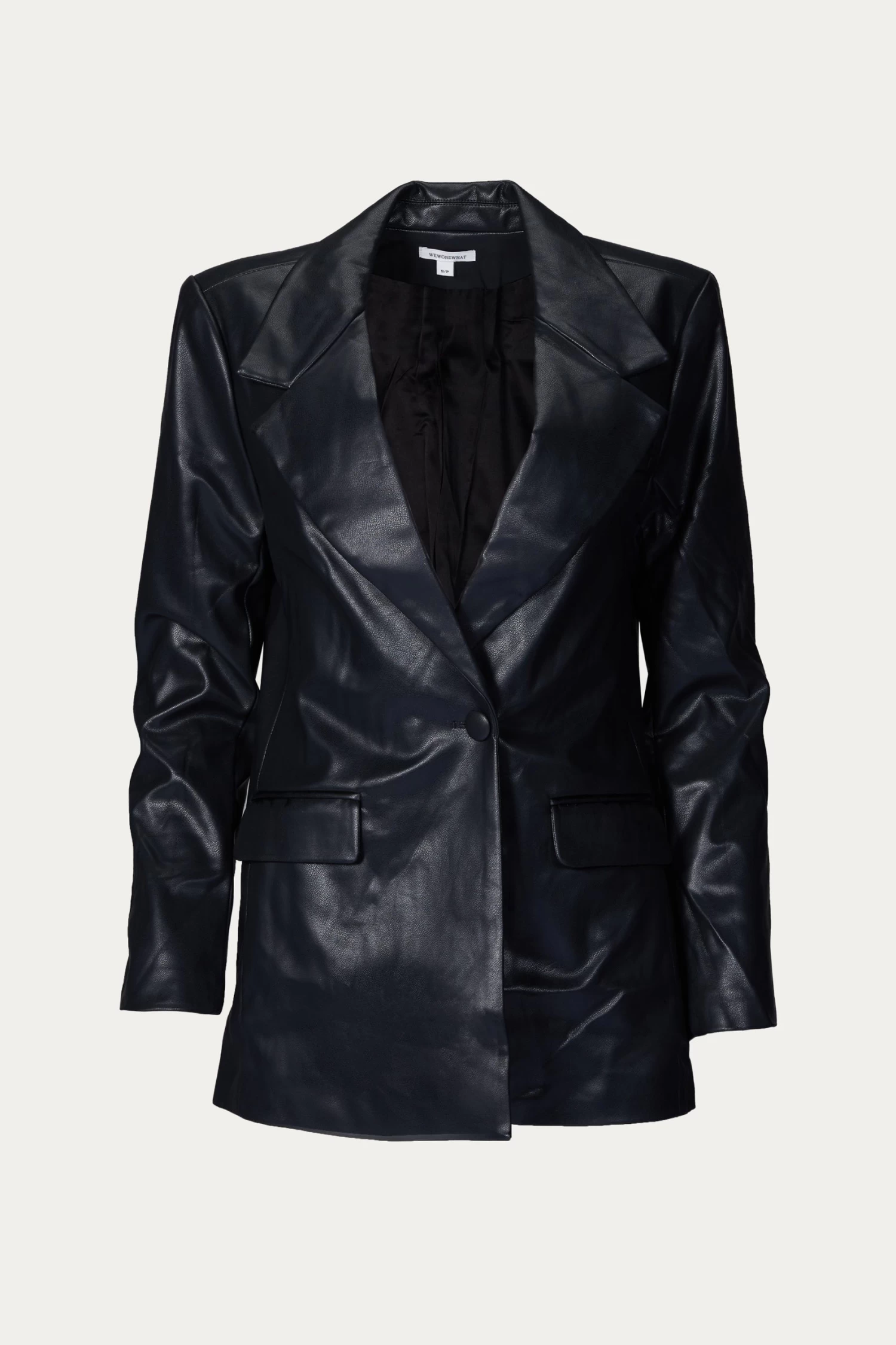 The Downtown Blazer is crafted from vegan leather that’s soft, slightly stretchy and glossy. It is tailored for an oversized fit and has lightly padded shoulders giving a touch of feminine tailoring to the masculine silhouette. Fully lined.