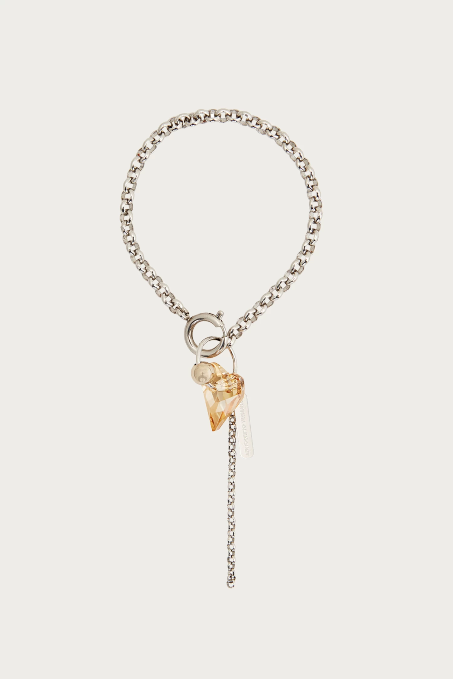 Recognized for its strong aesthetic, Justine Clenquet creates one-of-a-kind designs like this chain bracelet. Handcrafted in France from brass dipped in palladium, it’s designed with a golden shadow Swarovski crystal heart and drop link chain suspended from a small hoop. Wear yours alone or stack it with similar styles from the label.