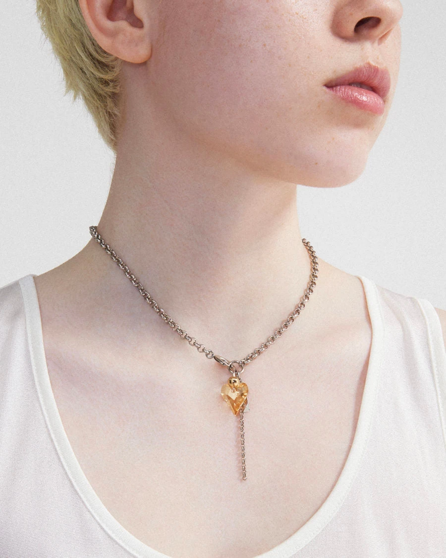 Recognized for its strong aesthetic, Justine Clenquet creates one-of-a-kind designs like this chain necklace. Handcrafted in France from brass dipped in palladium, it’s designed with a golden shadow Swarovski crystal heart and drop link chain suspended from a small hoop, creating a lariat effect. When wearing a low-back blouse, turn the necklace and wear the clasp and adornments to the back.