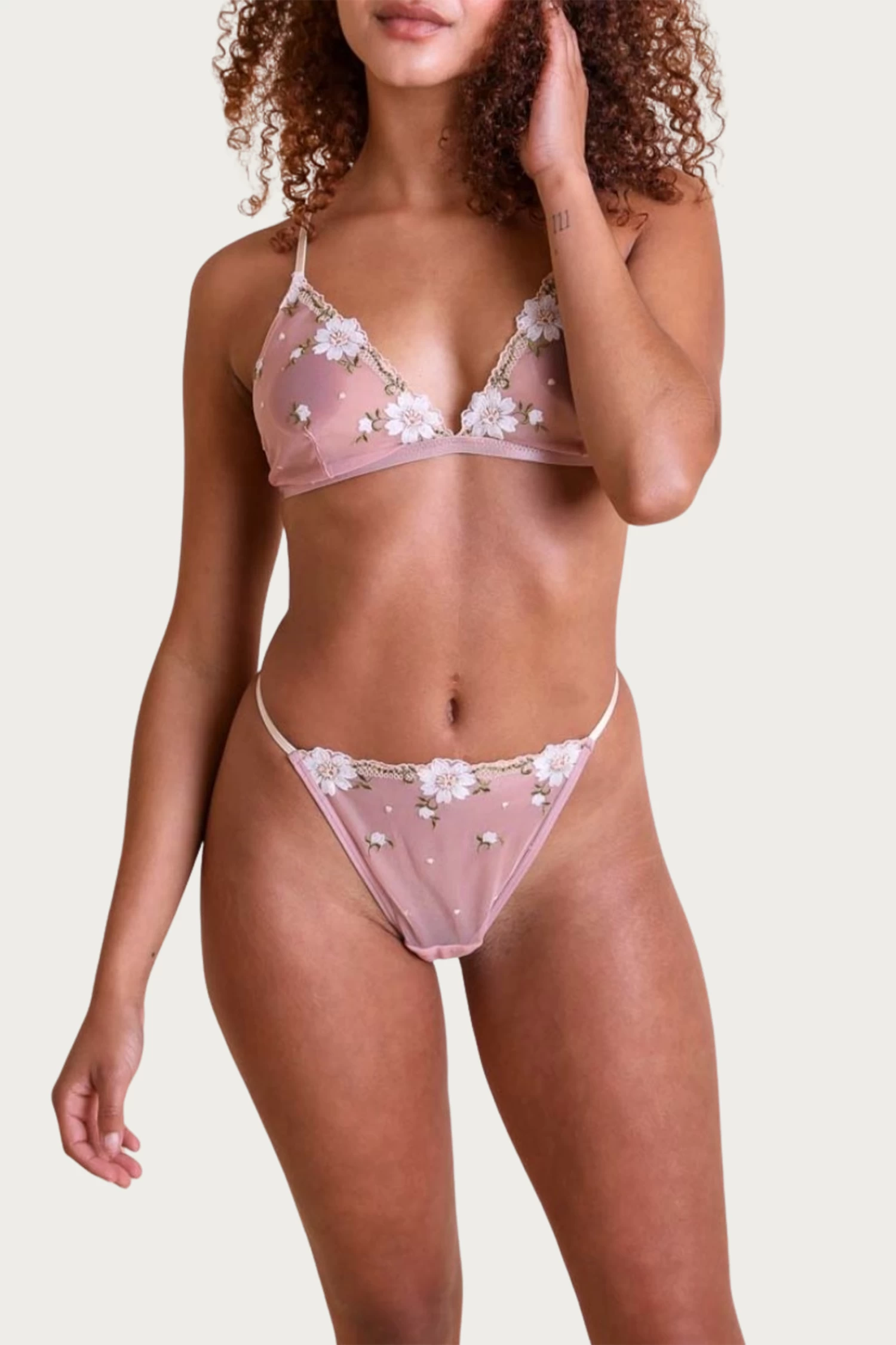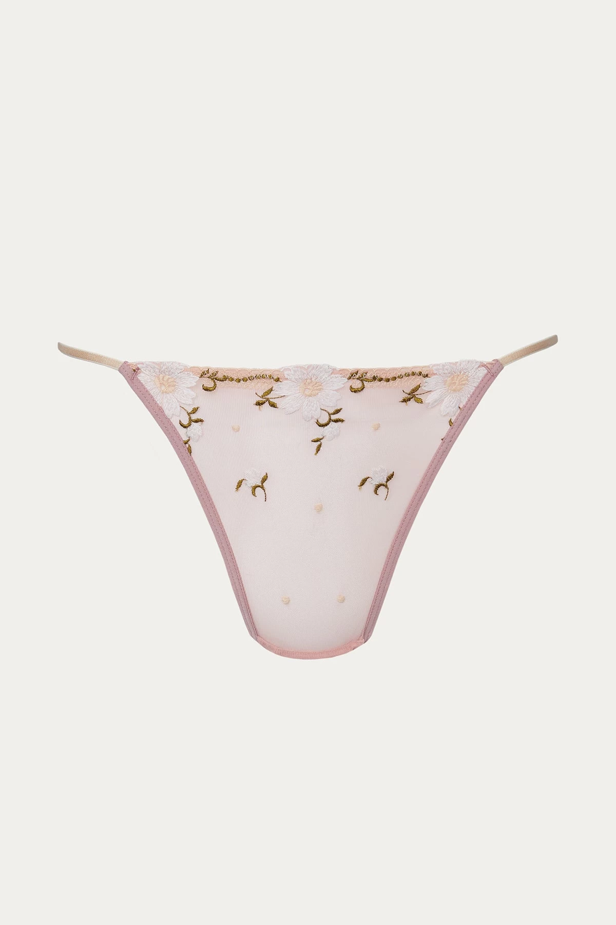 Leto Accessories’ thong is just as comfortable as it is pretty – so it won’t need to be reserved for special occasions. It has been made from wispy light pink tulle and artfully embroidered with blooms and satin trims. Complete the set with the matching bra in the same hue.