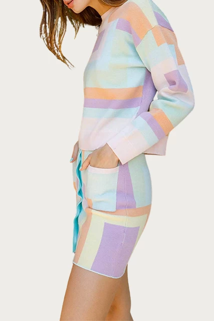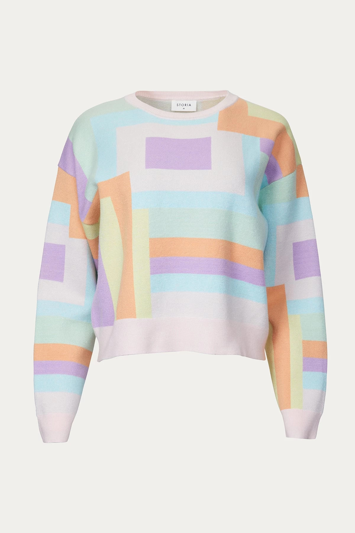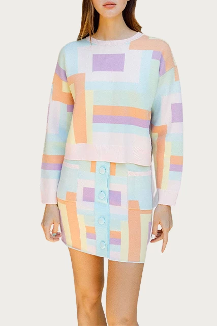 A nod to ’80s styles, Storia’s sweater is made from pastel knit and patterned with geometric shapes. It’s cut for a relaxed fit that’s enhanced by dropped shoulders and has a slightly cropped hem. Style yours with the matching skirt and sneakers.