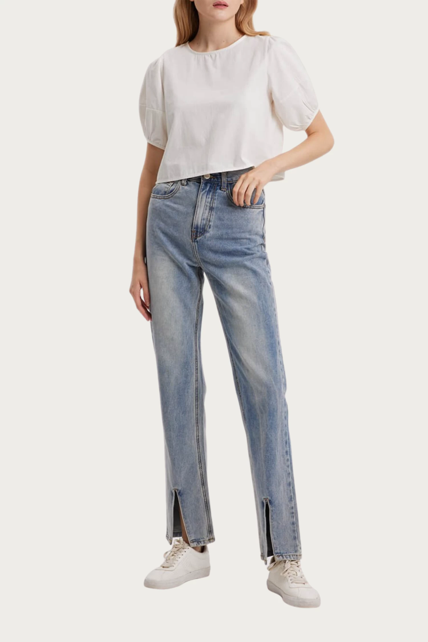 Champion a modern mood with Gentle Herd’s jeans. Made of cotton-denim with a hint of stretch, they comfortably sit high on the waist and have chic split-hems that look great with sandals, sneakers and boots alike.Â