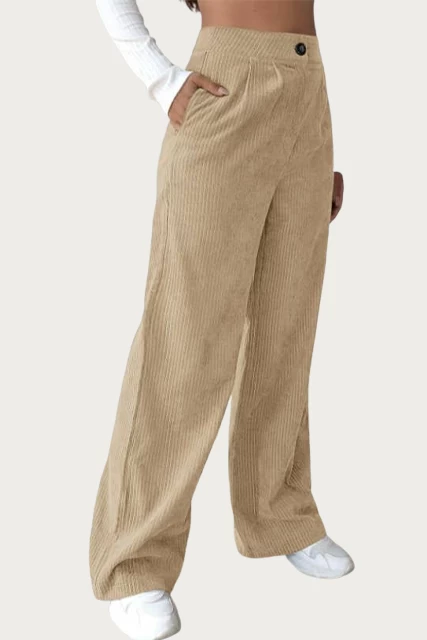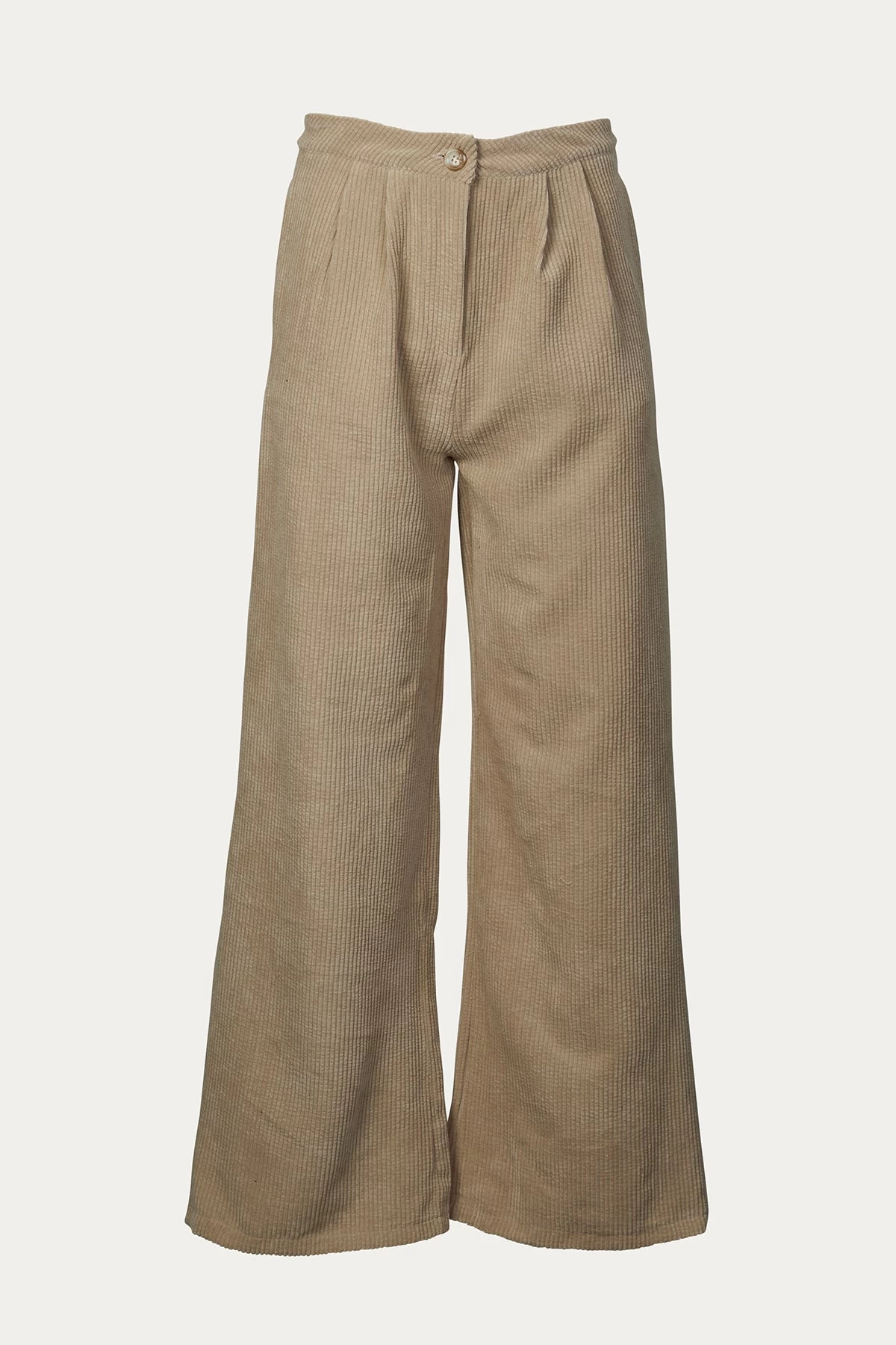 Fill your closet with modern wardrobe heroes, like Trend Shop’s corduroy pants. Cut from plush corduroy in classic beige, they have wide legs and a pleated, high-rise waist. Wear them with a T-shirt or a chunky knit.Â