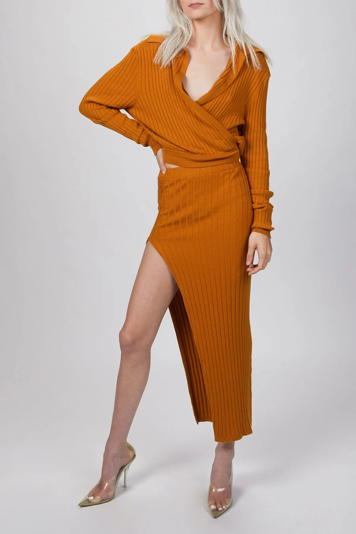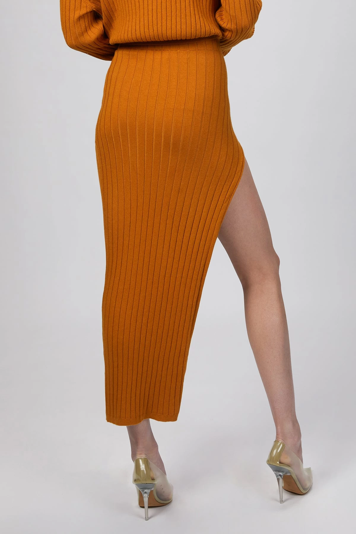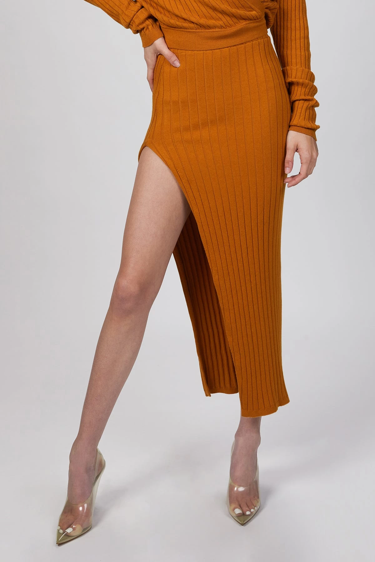 This ‘Irenna’ knit midi skirt is ribbed throughout and framed by a split at one side. The elastic waistband ensures a precise and comfortable fit. Pair it with the matching ‘Fusako’ knit top to complete the set.