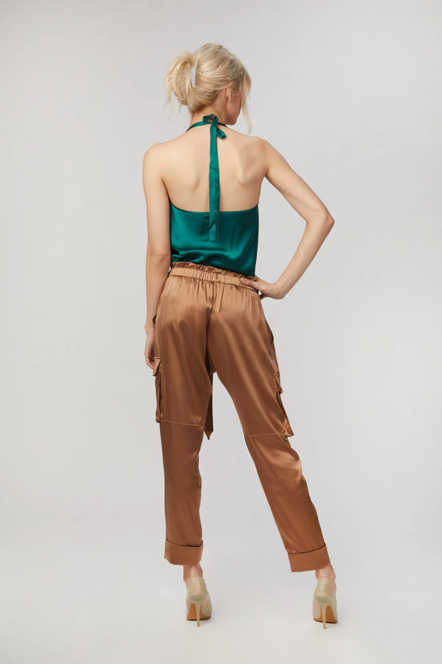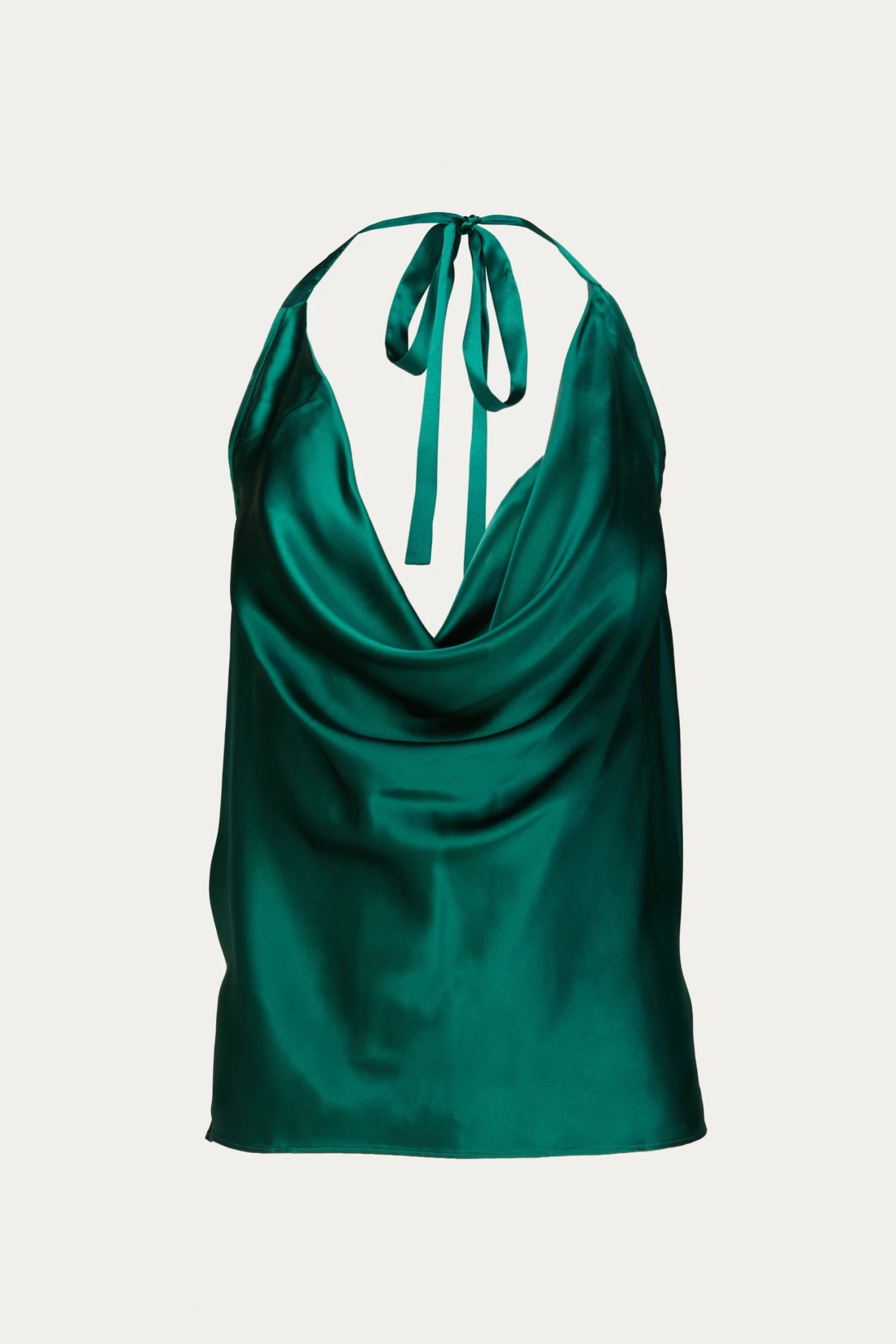 Crafted in an emerald green silk sandwash charmeuse, this ‘Jackie’ has a draped halterneck with a self-adjusting tie. Dress up jeans or pair with one of the label’s languid pants for your next evening out.