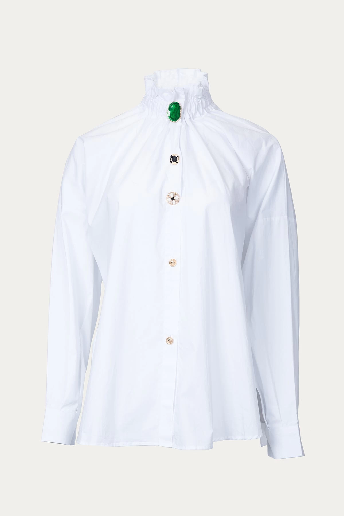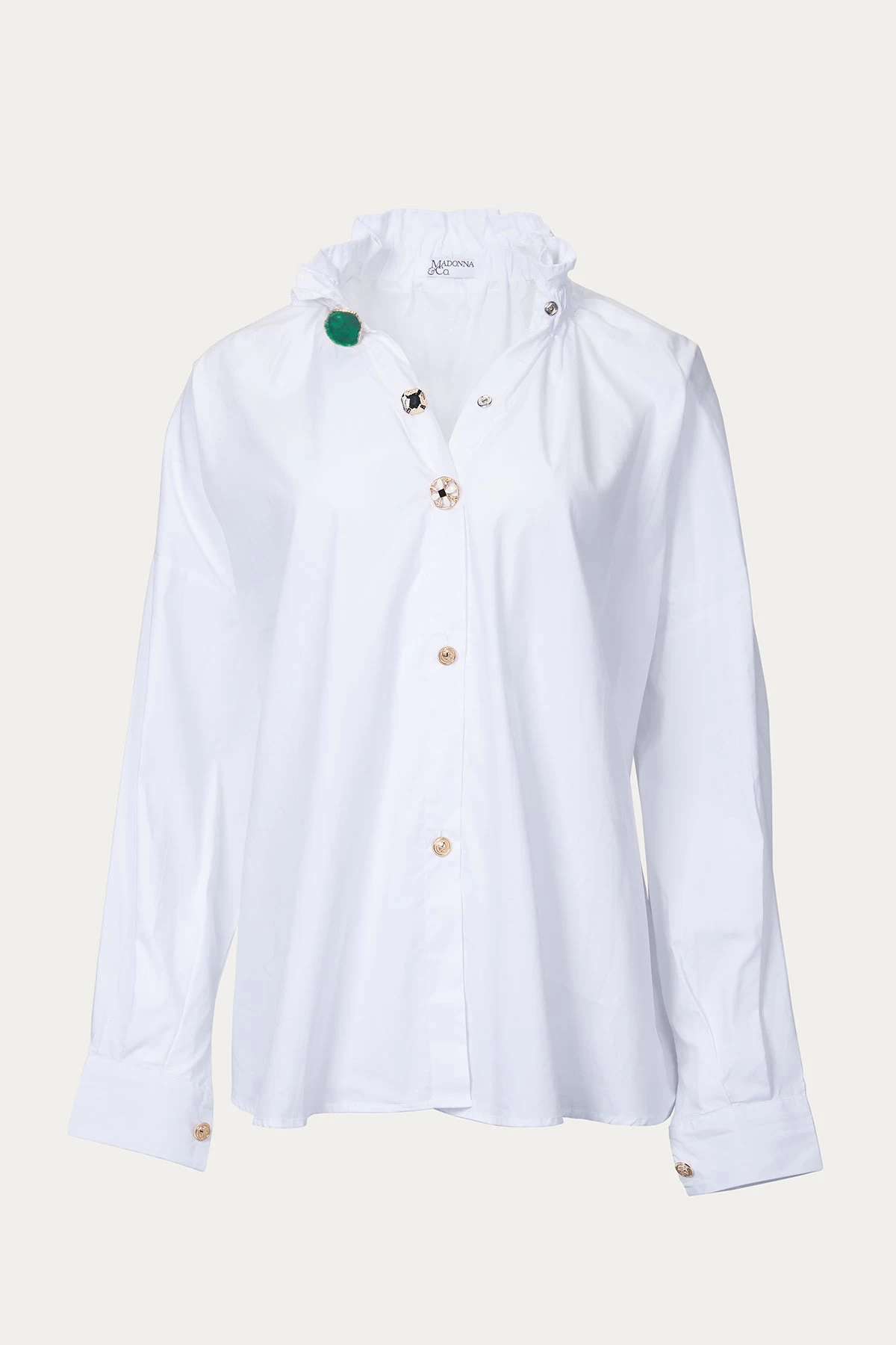 Luxe & Leather by Madonna & Co revamps the classic button-down shirt by adding varying jeweled buttons. It’s made from crisp cotton-poplin with a ruffled mock neckline. Style yours with denim or relaxed tailoring. One size fit – accommodates sizes XS-L and all body types.