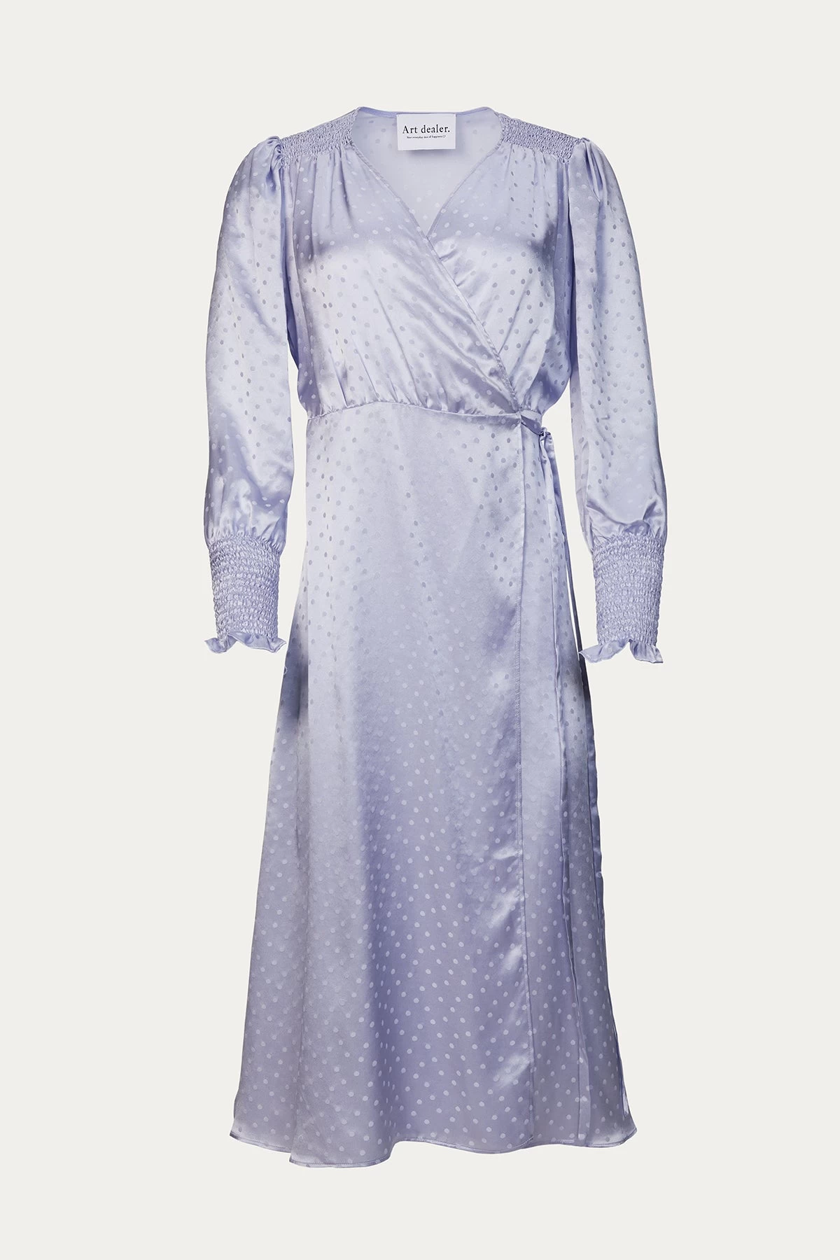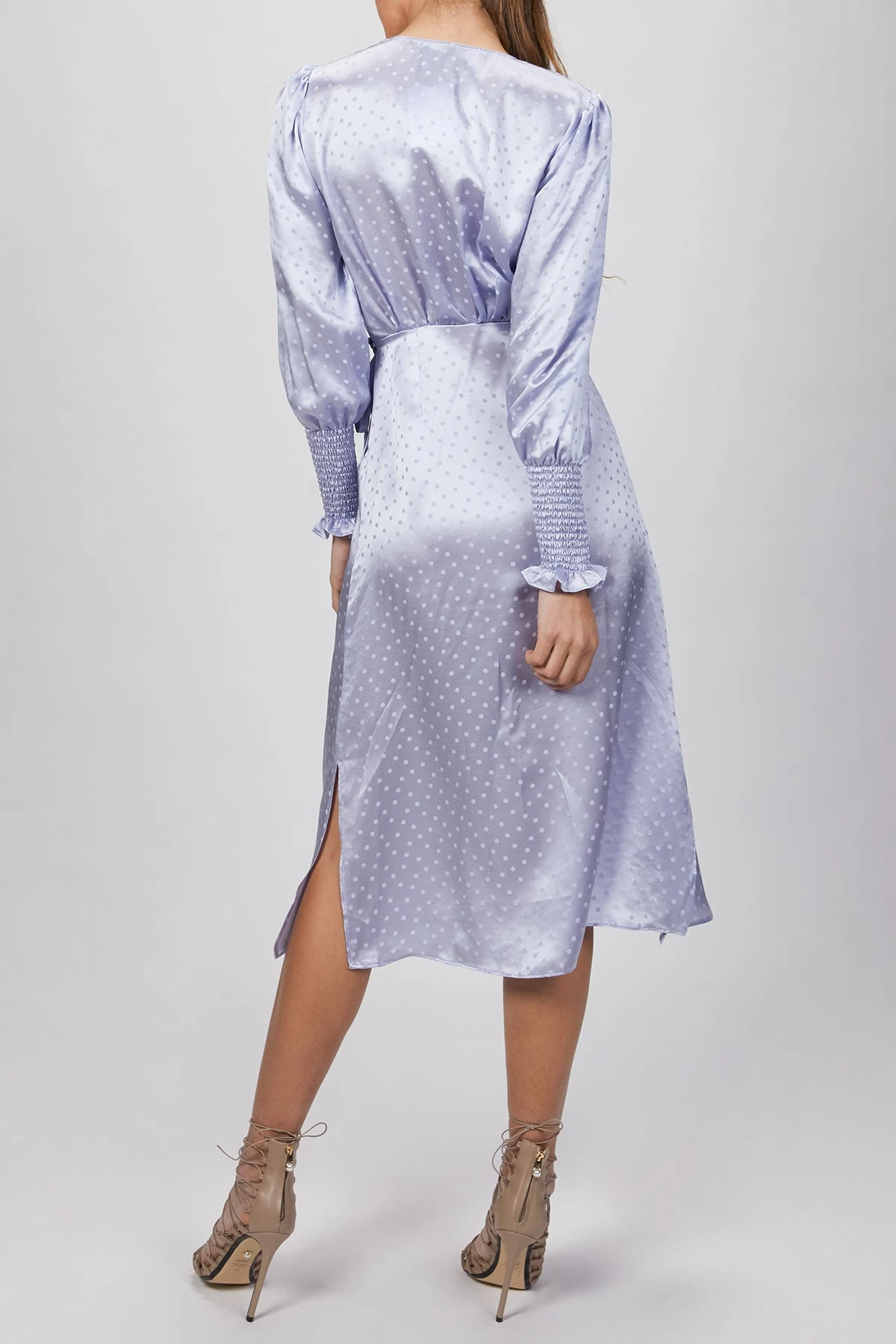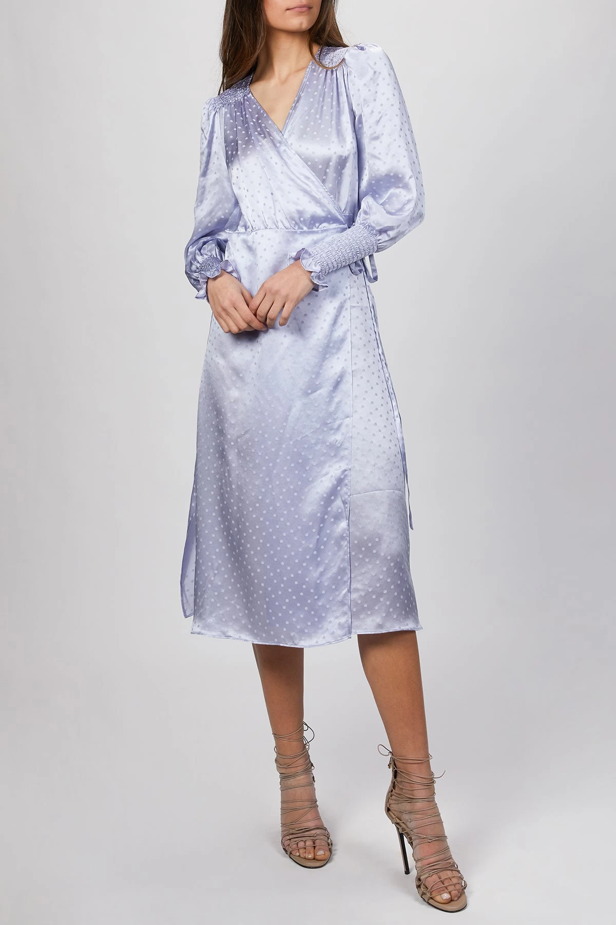 This lavender midi ‘Kate’ dress has the most feminine details. It is crafted from lightweight Italian silk that’s jacquard-woven with tonal polka dots. It has shirred panels above the wrist that flow to flouncy flared cuffs, making it flirty and romantic. The wrap bodice and skirt create a side slit, allowing movement as you walk. Style yours with strappy sandals and a clutch.