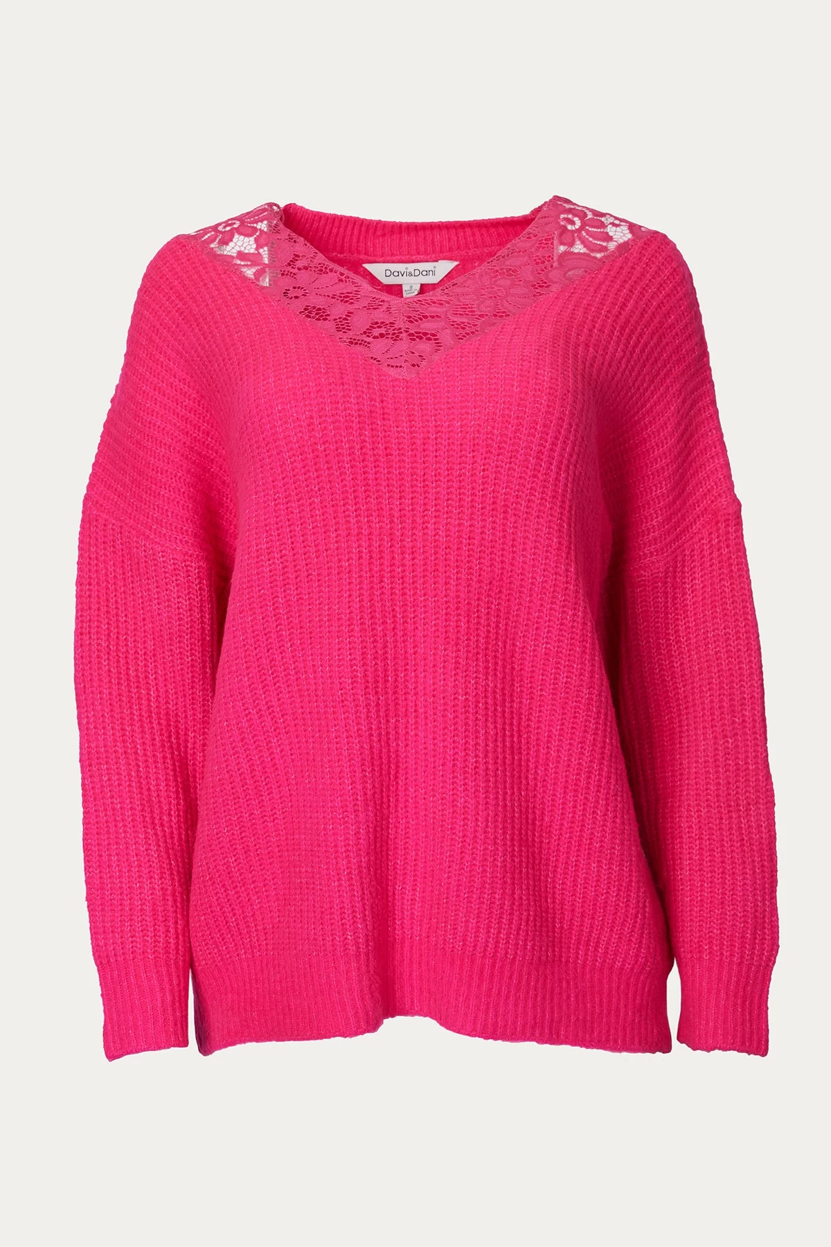 J.NNA enriches this fuchsia sweater with a romantic touch of lace. Scallop-edged ornamental openwork frames the design’s V-neckline, highlighting the décolletage. Providing just the right amount of warmth for fall, it’s made from mid-weight ribbed-knit.