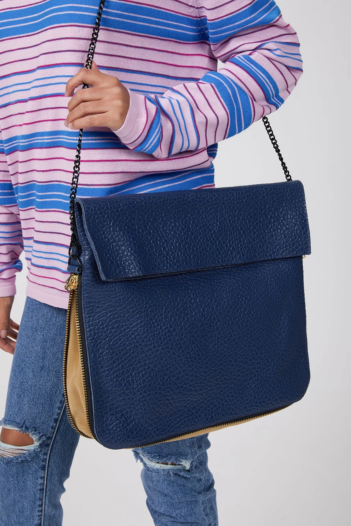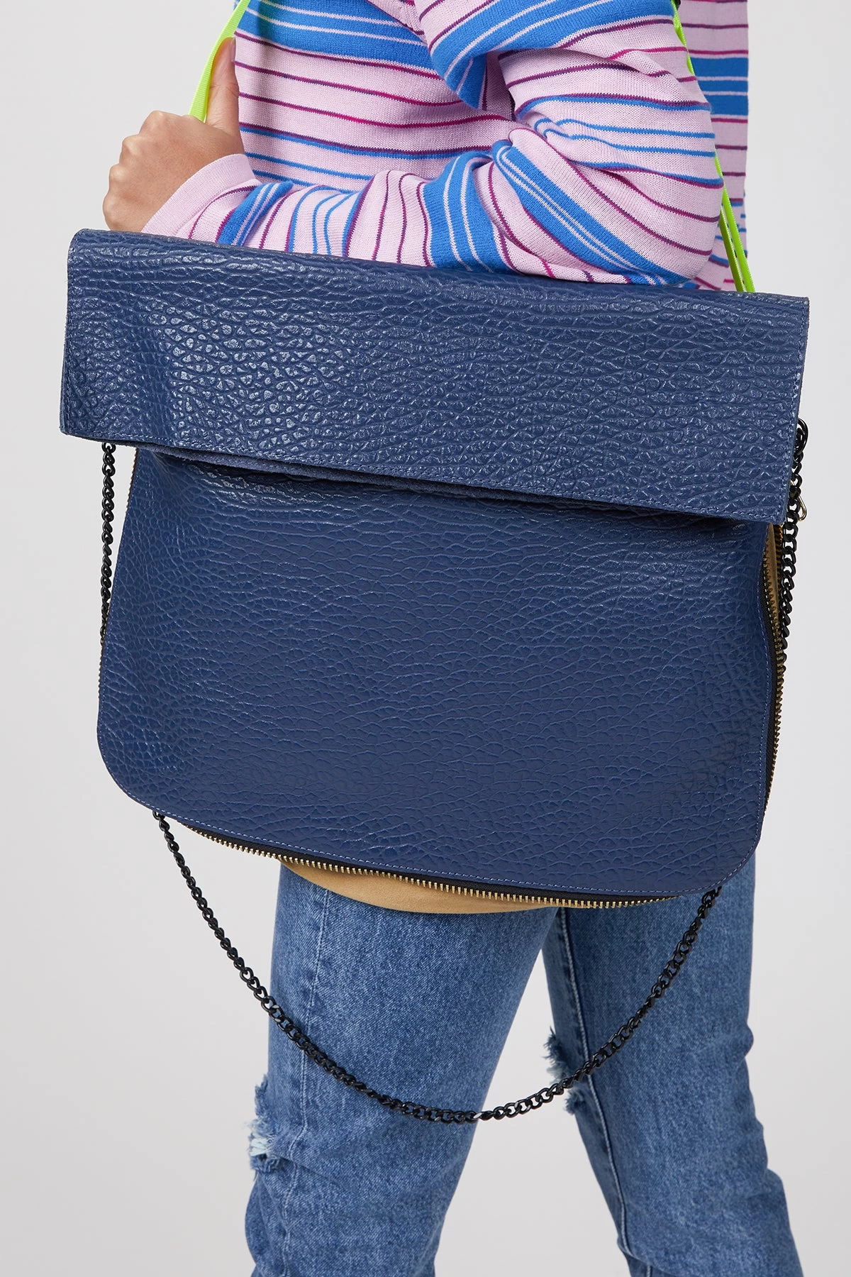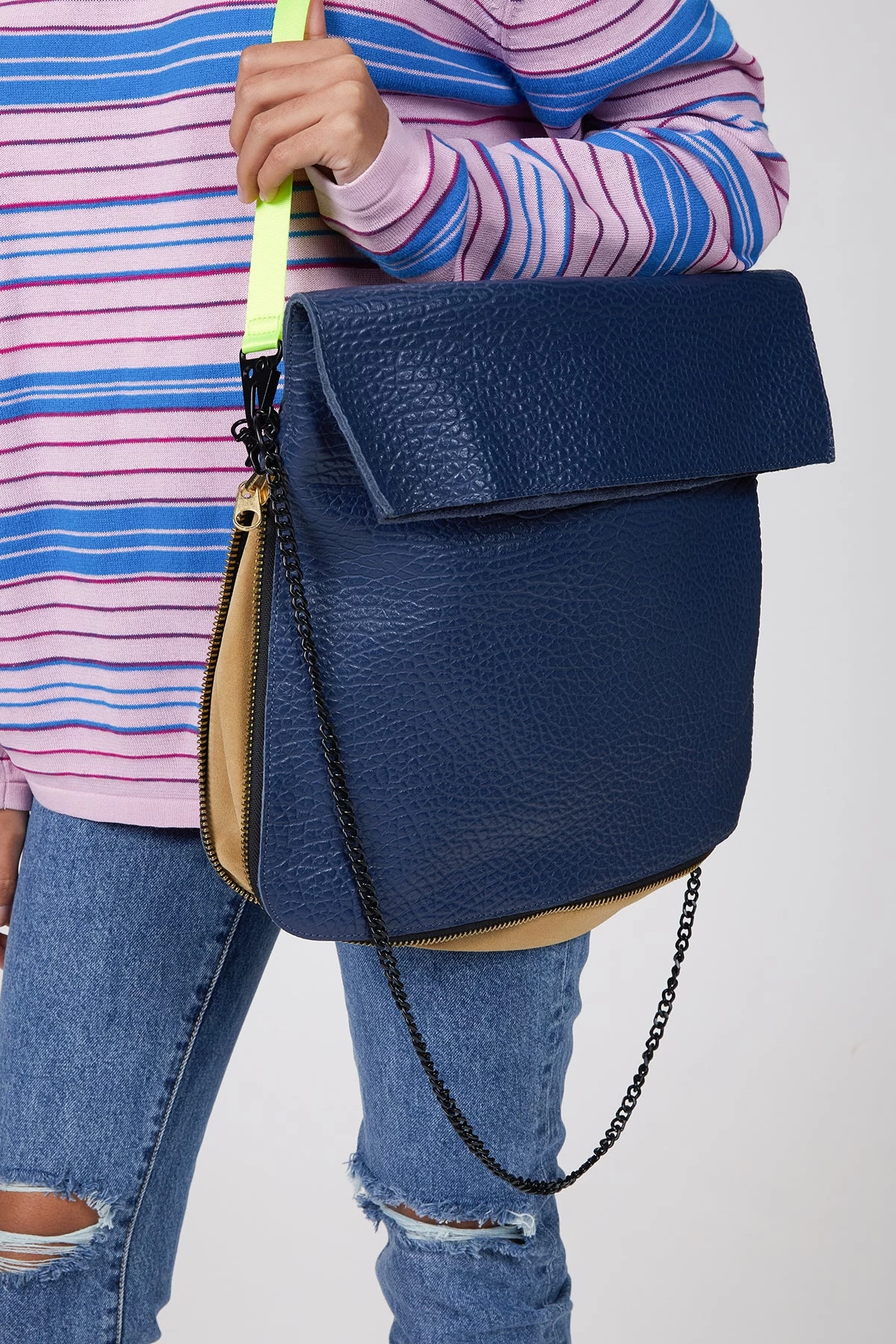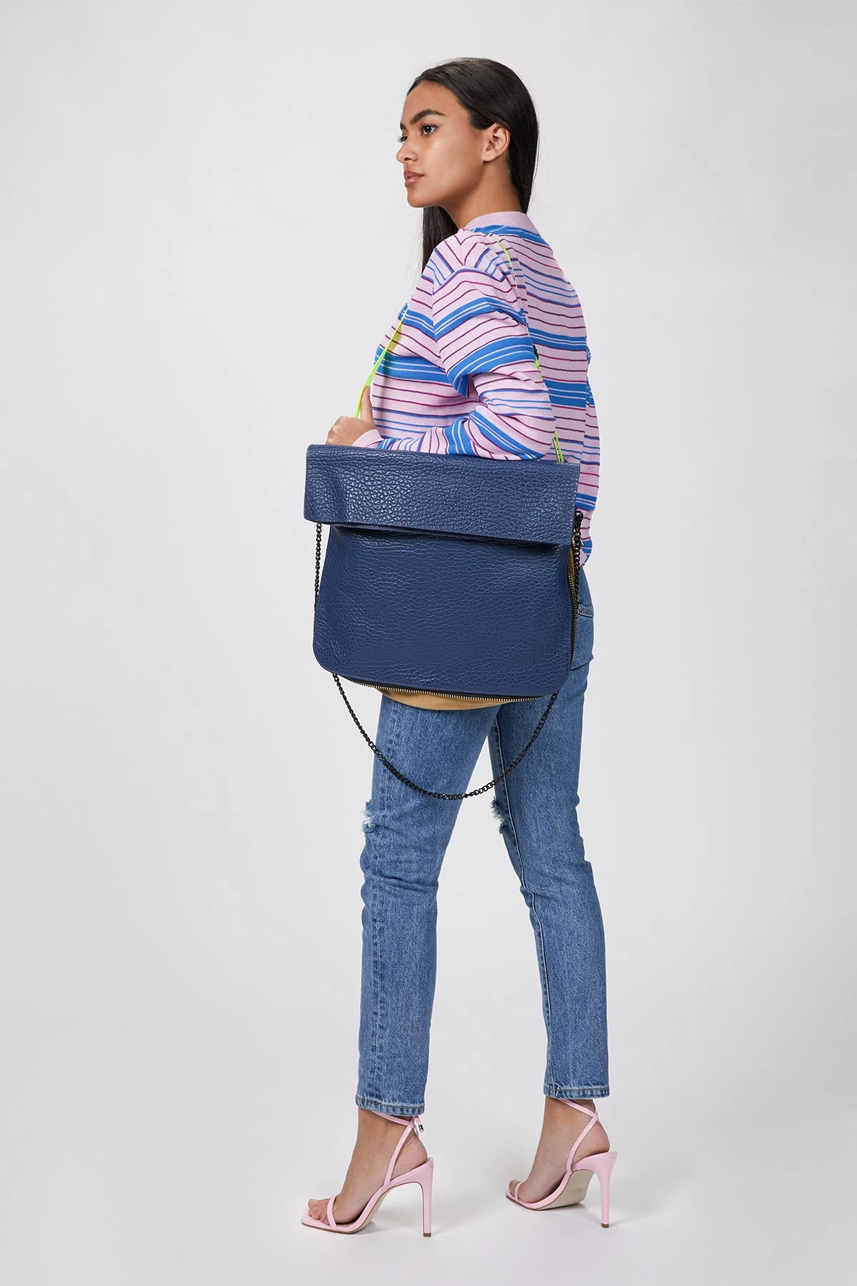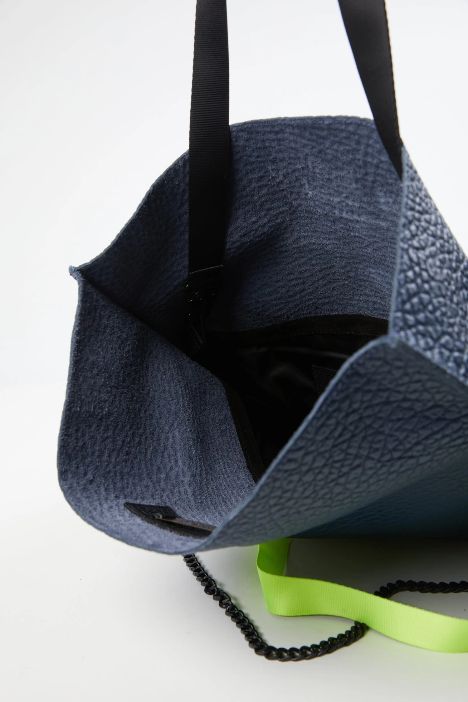 Ampersand As Apostrophe’s ‘Buffalo Parcel’ has reached a high status for its timeless construction and versatile styling – it can be worn as a cross-body, over the shoulder, tall tote or clutch. It has been crafted from blue leather and comes with a solid metal chain and two adjustable nylon straps in black and neon-yellow – all can be paired, removed or interchanged. A dust bag is included to protect the leather in between uses.