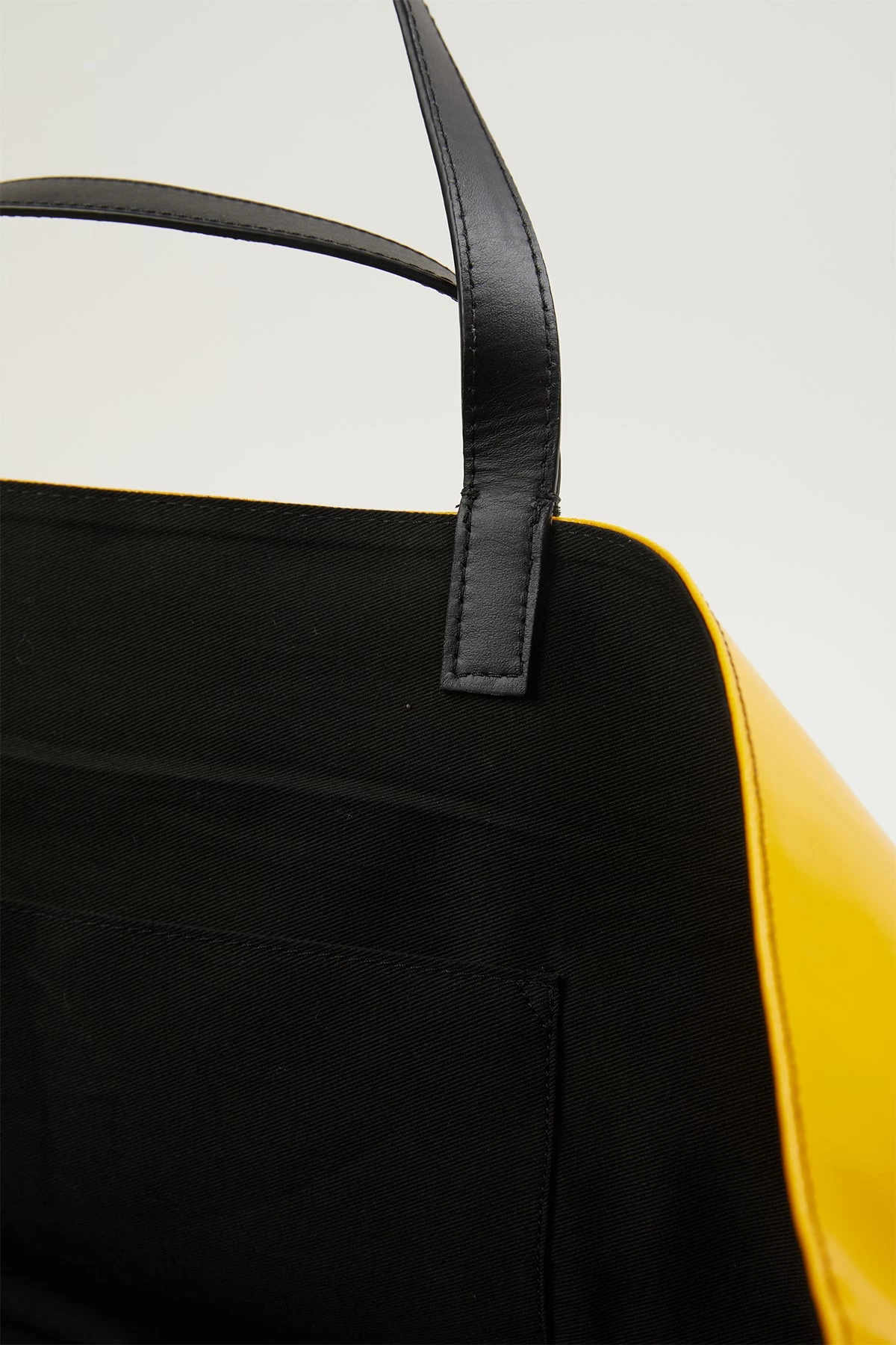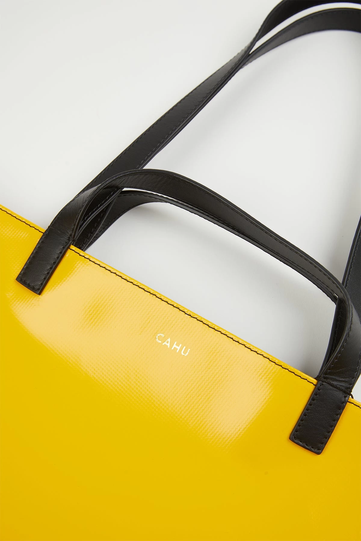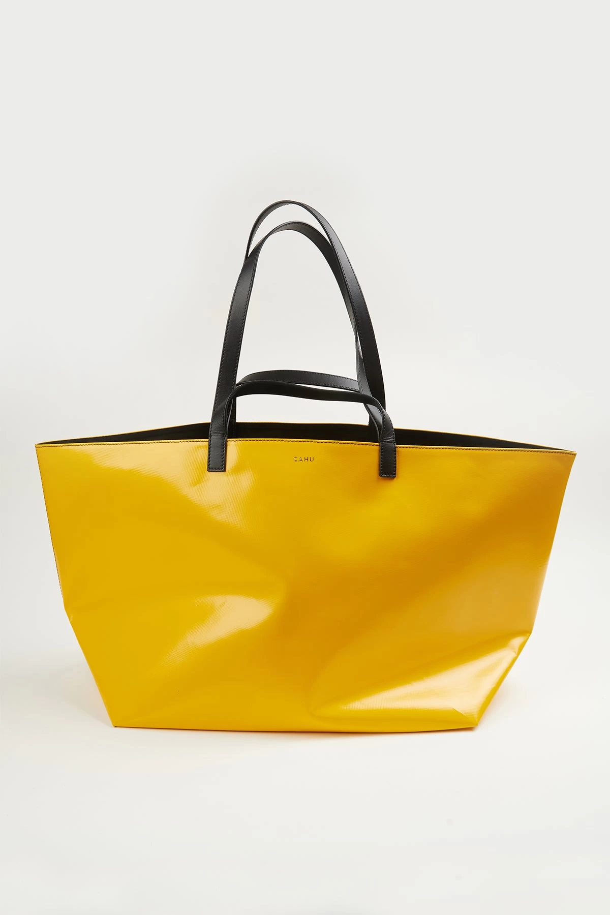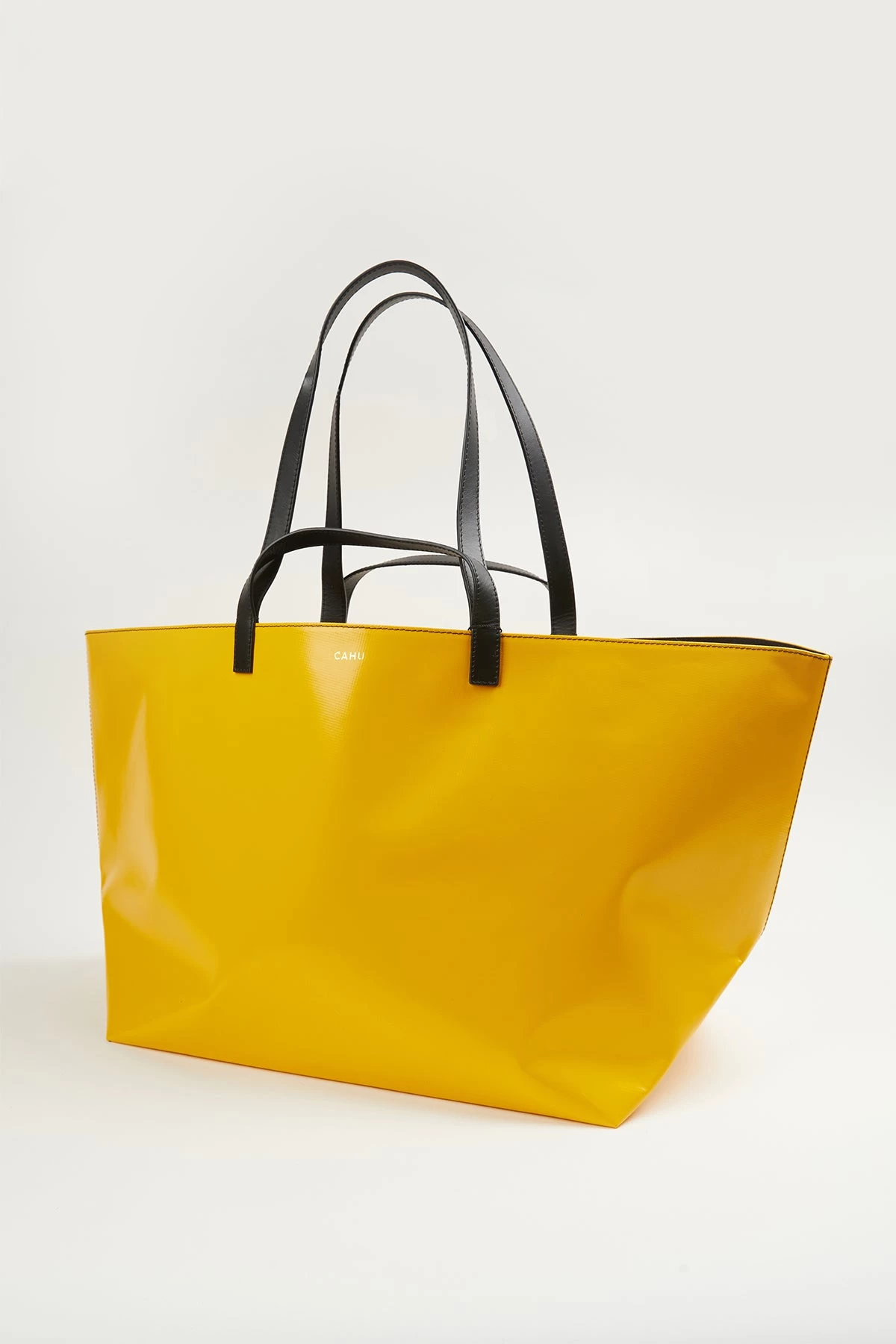 Made of waterproof PVC fabric, Cahu’s yellow ‘Le Petit Pratique’ shopper is easy to maintain and sized perfect for a busy lifestyle. The inner lining is crafted from black cotton and it is large enough to fit a laptop, books and a change of clothes. There is a zippered pocket in the main compartment for small essentials. Carry it by the leather handles on your shoulder or in your hand with an array of everyday edits.