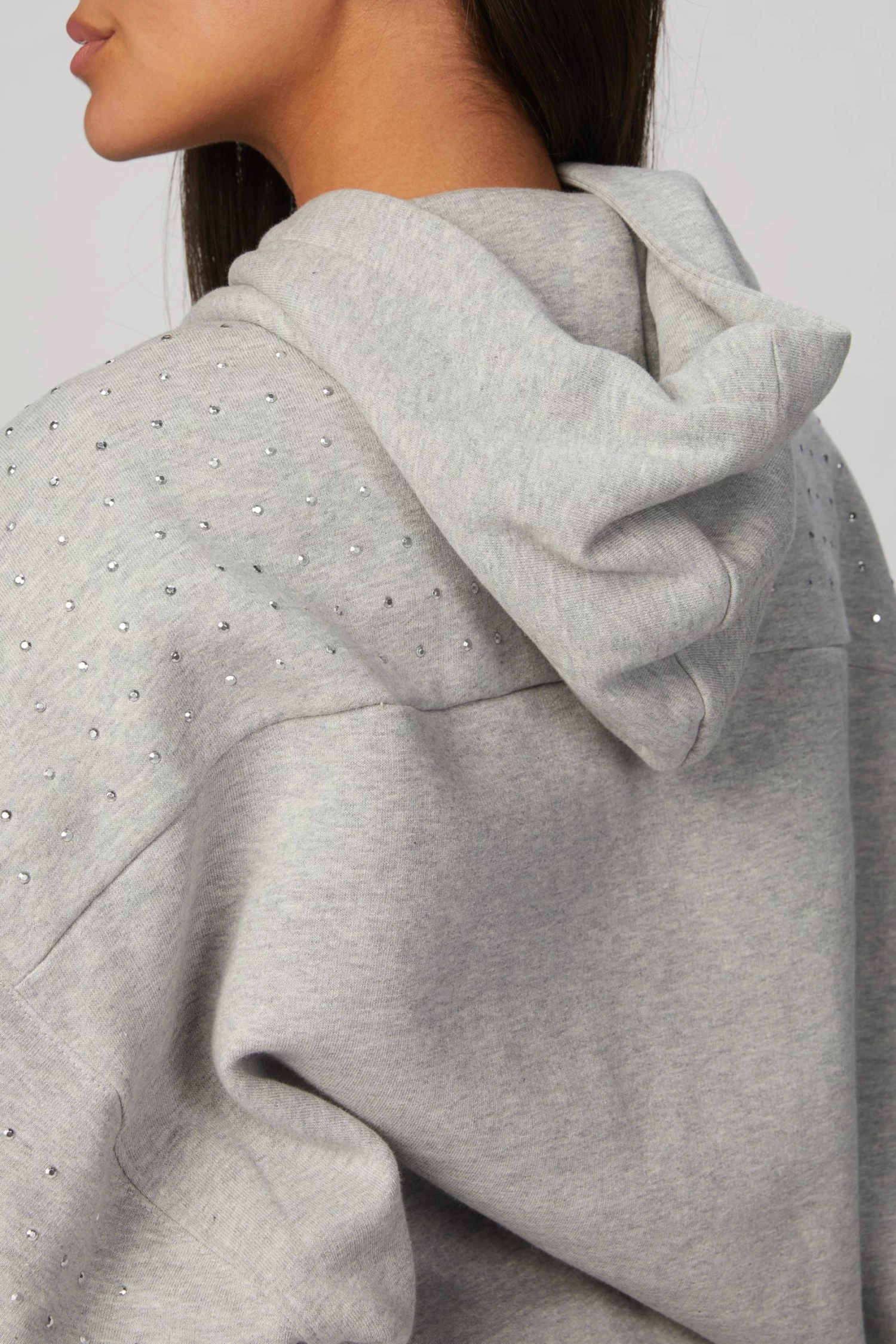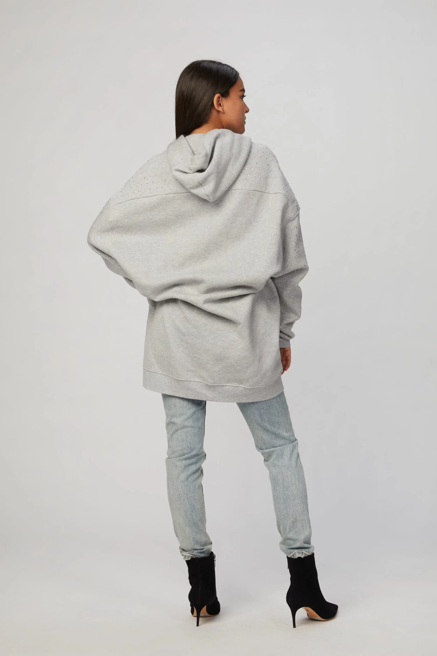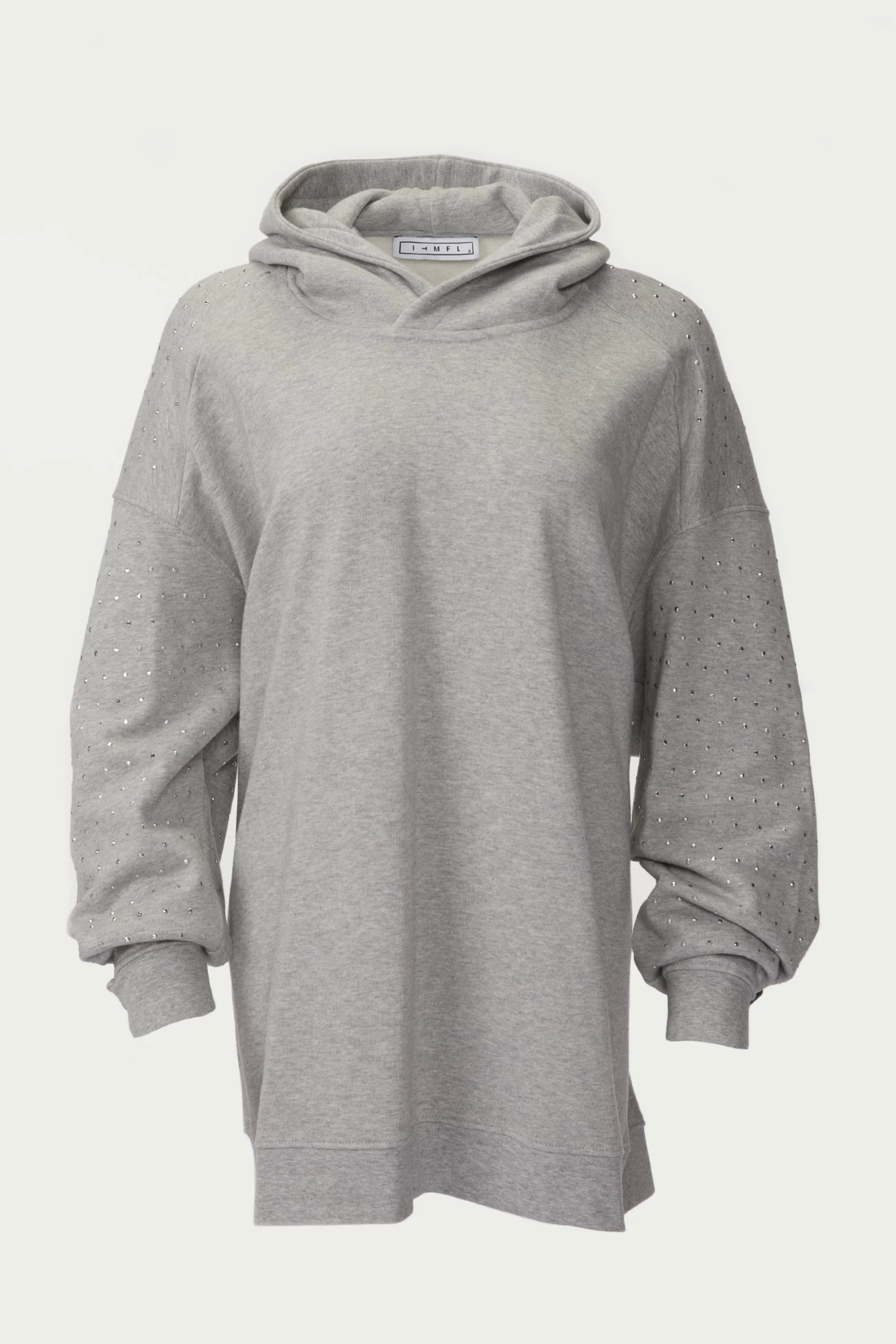 Oversized jersey hoodie with soft sequin back panel. Long sleeves with ribbed cuffs and high low hemline.
