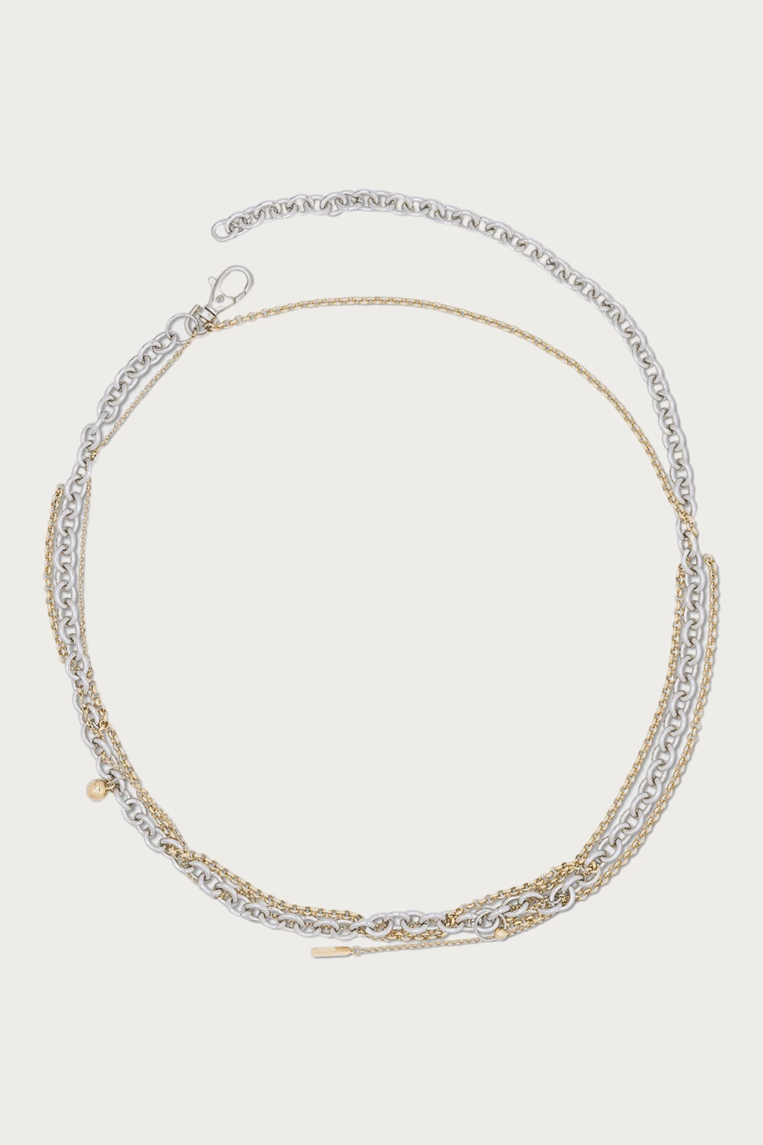 Based in France, Justine Clenquet takes its influence from underground culture, ’90s nostalgia and timeless elegance to inspire its signature style. Handmade from palladium and 24k pale gold-plated brass, this ‘Lewis’ belt has layers of mixed metal, intertwined chain links that end with multiple drops. The adjustable clasp allows you to perfect the fit. Layer yours over dresses and blazers alike.