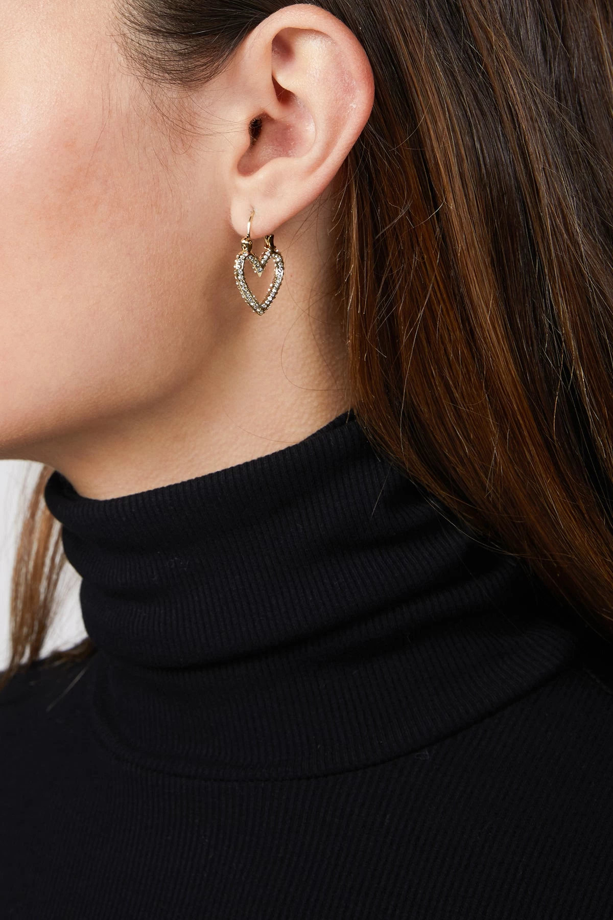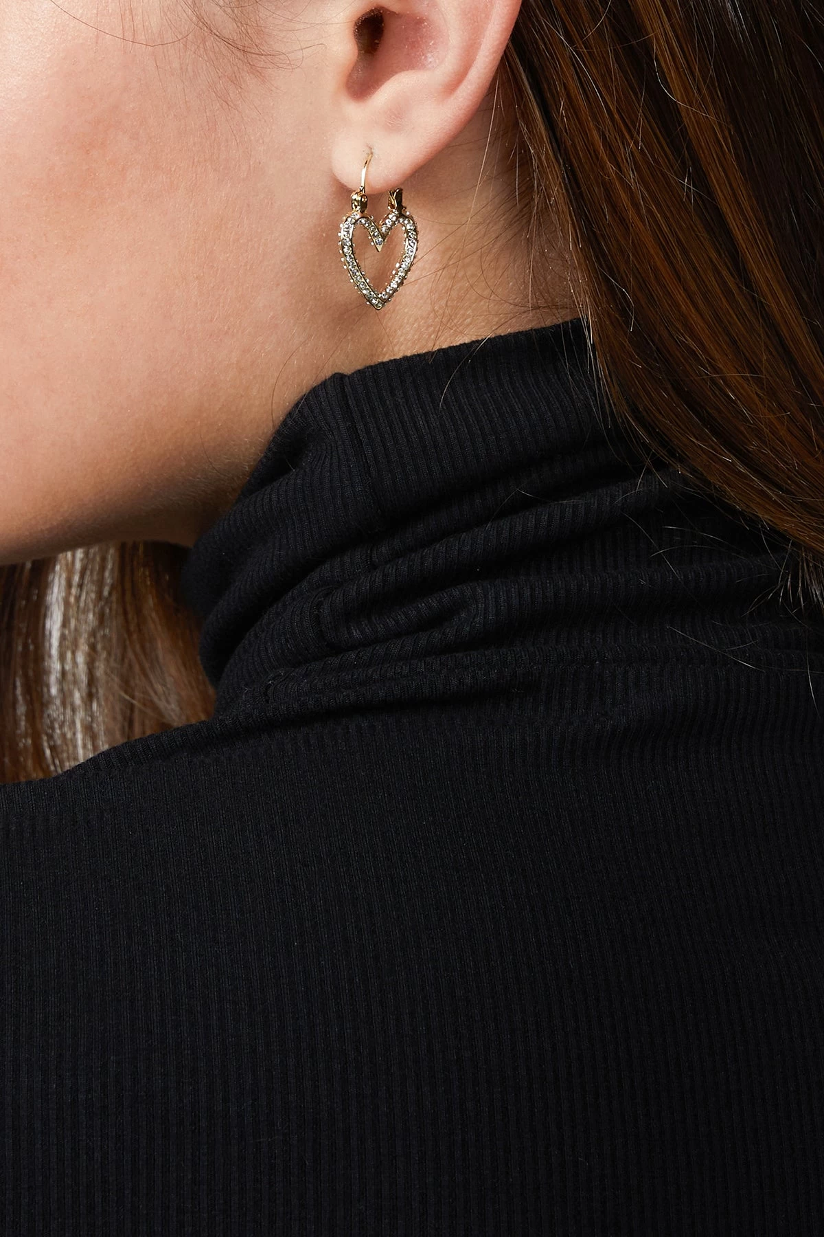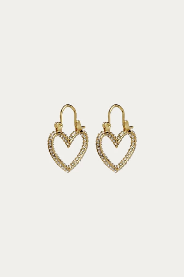This dainty hoop huggie is cast from gold-plated brass and traced with rows of sparkling, clear crystals in a darling heart shape. They have a curved wire fastening. Sold as a pair.