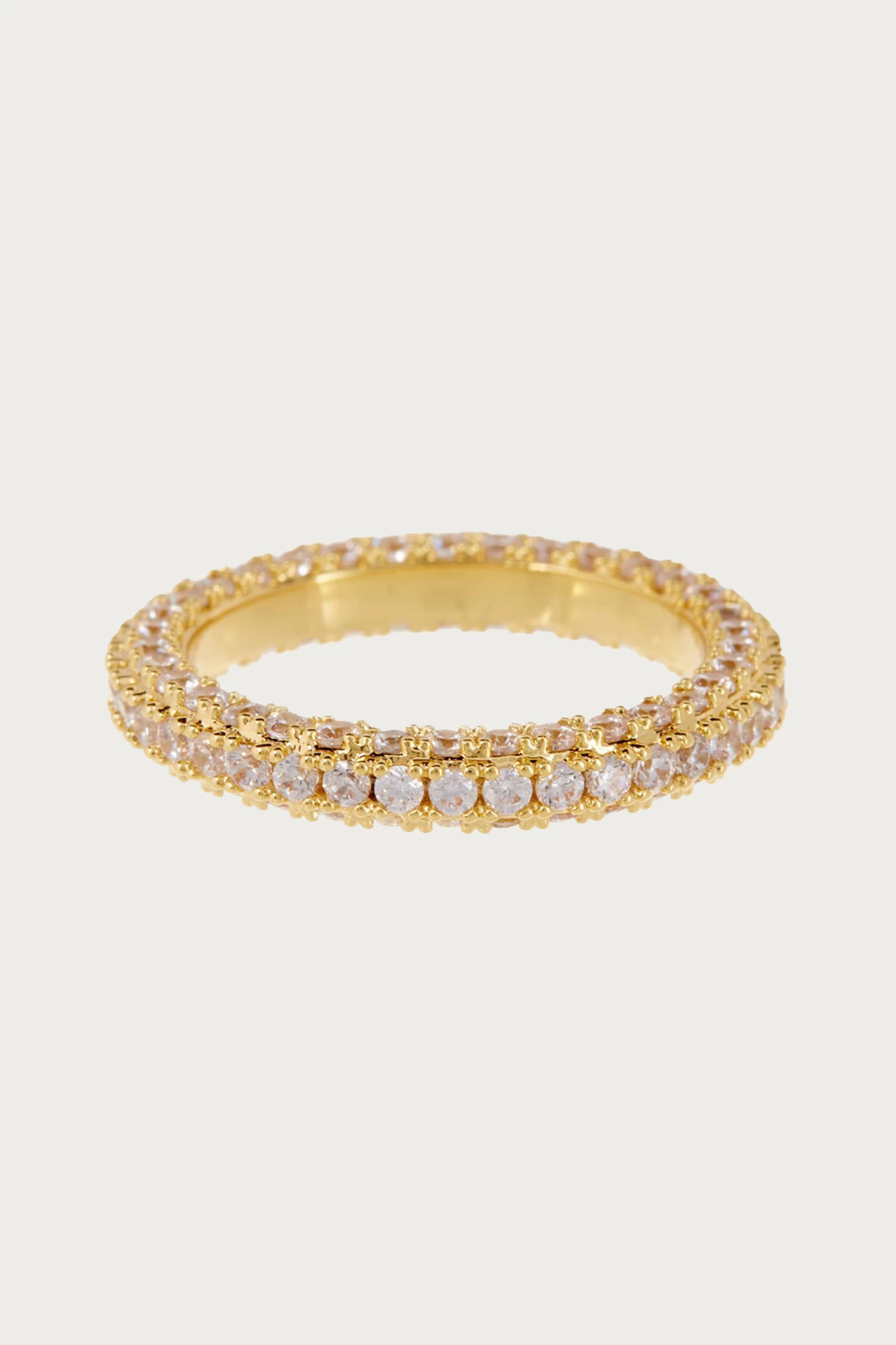 Luv AJ’s pieces are designed for everyday wear. This gold ring is cast from gold-plated brass and is encrusted with sparkling pavé crystals. It’s the perfect ring for stacking or making a statement its own.