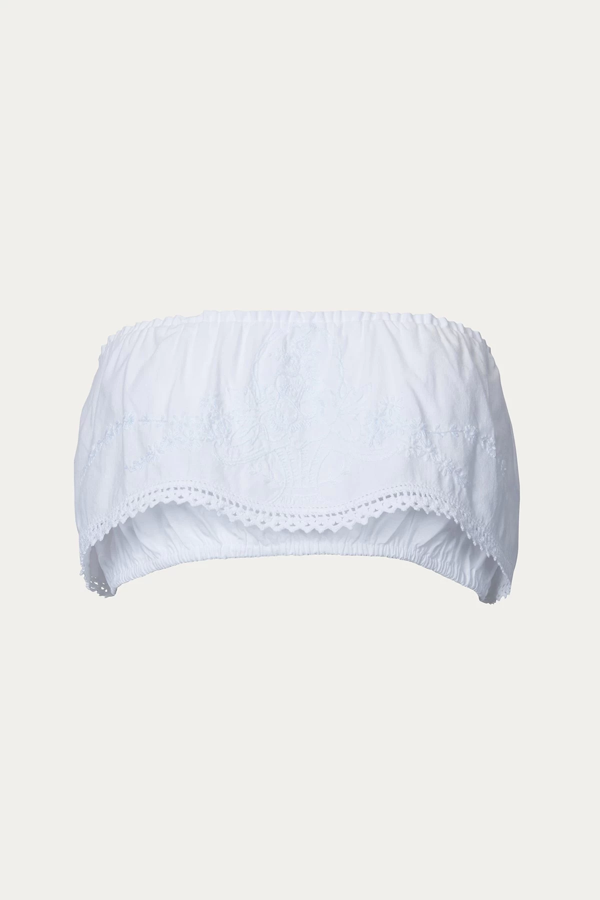 Perfect for your next warm-weather getaway, Merritt Charles’ top is cropped to just below the bust and has a flowy overlay. It has been made of vintage fabrics and has a strapless neckline that’s elasticated to keep it securely in place. We love the details – hand-embroidery and dainty scalloped trim. One size fit.