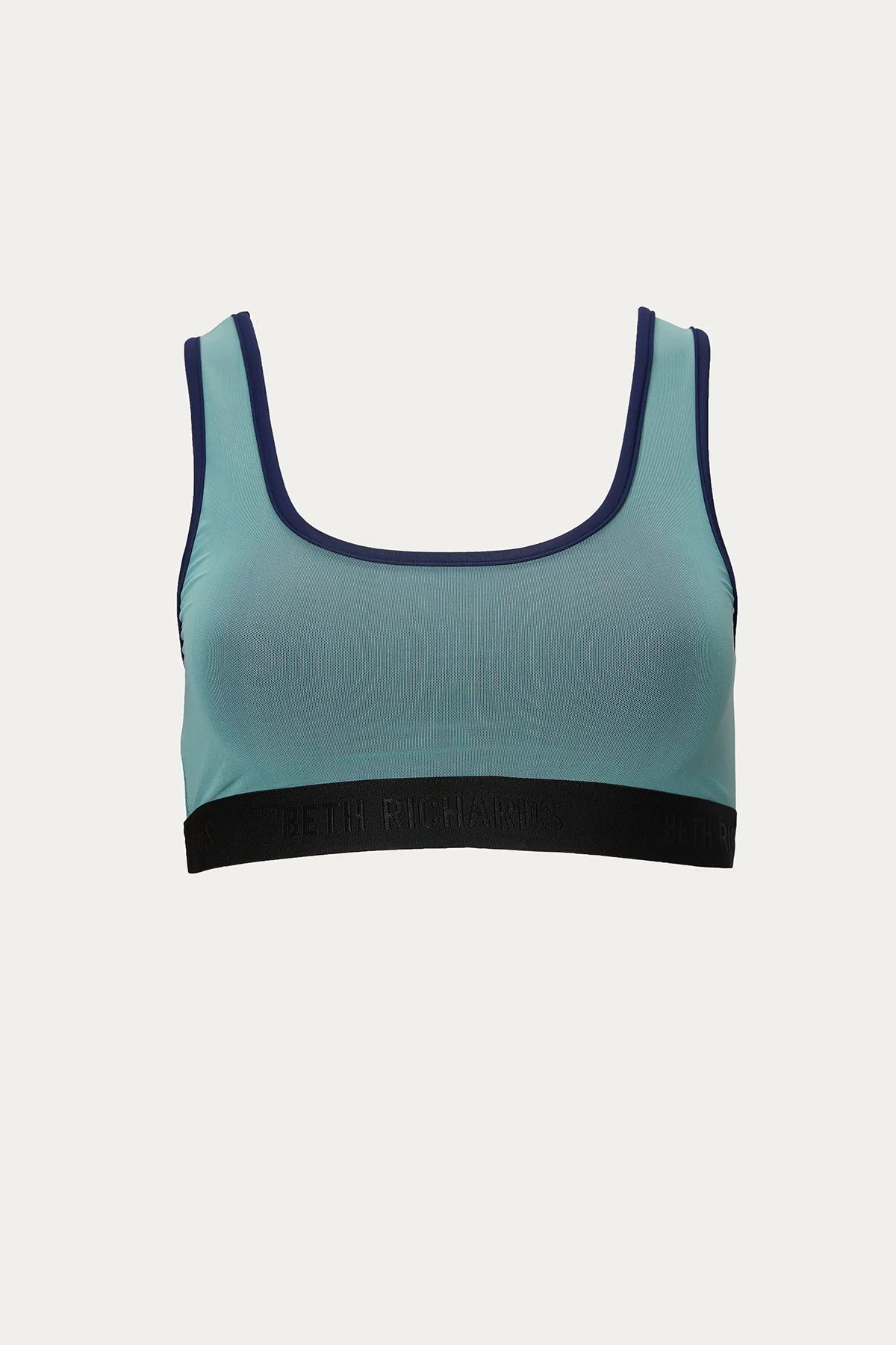 Beth Richards’ ‘Kim’ bikini top has thick supportive straps and is free from wiring or padding. This classic tank bikini top has a mesh overlay with a logo band below the bust and offers UPF 50+ protection protection against UV rays. It’s designed to be worn with the matching ‘Kim’ bikini bottoms.