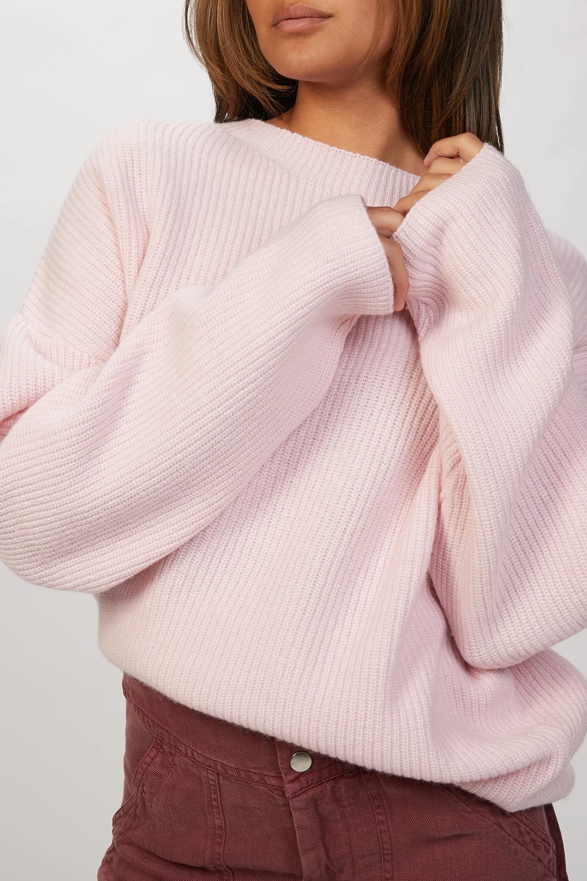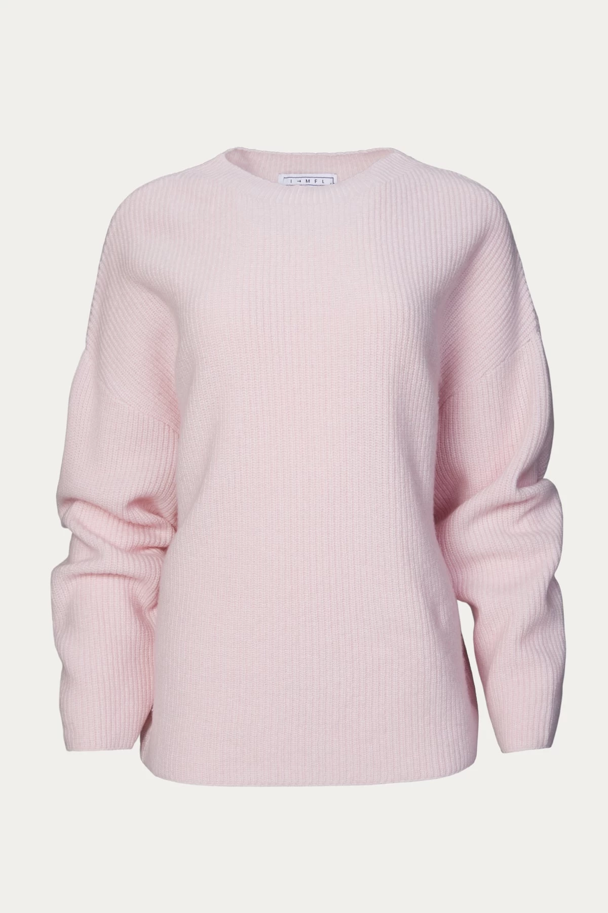 Crafted in Turkey from blended wool and cashmere, this oversized sweater features a dropped shoulder and is rib-knitted in a light pink shade the label calls ‘Powder’. It has a crew neckline framed with ribbed edges. The oversized fit looks cool with jeans or baggy shorts.