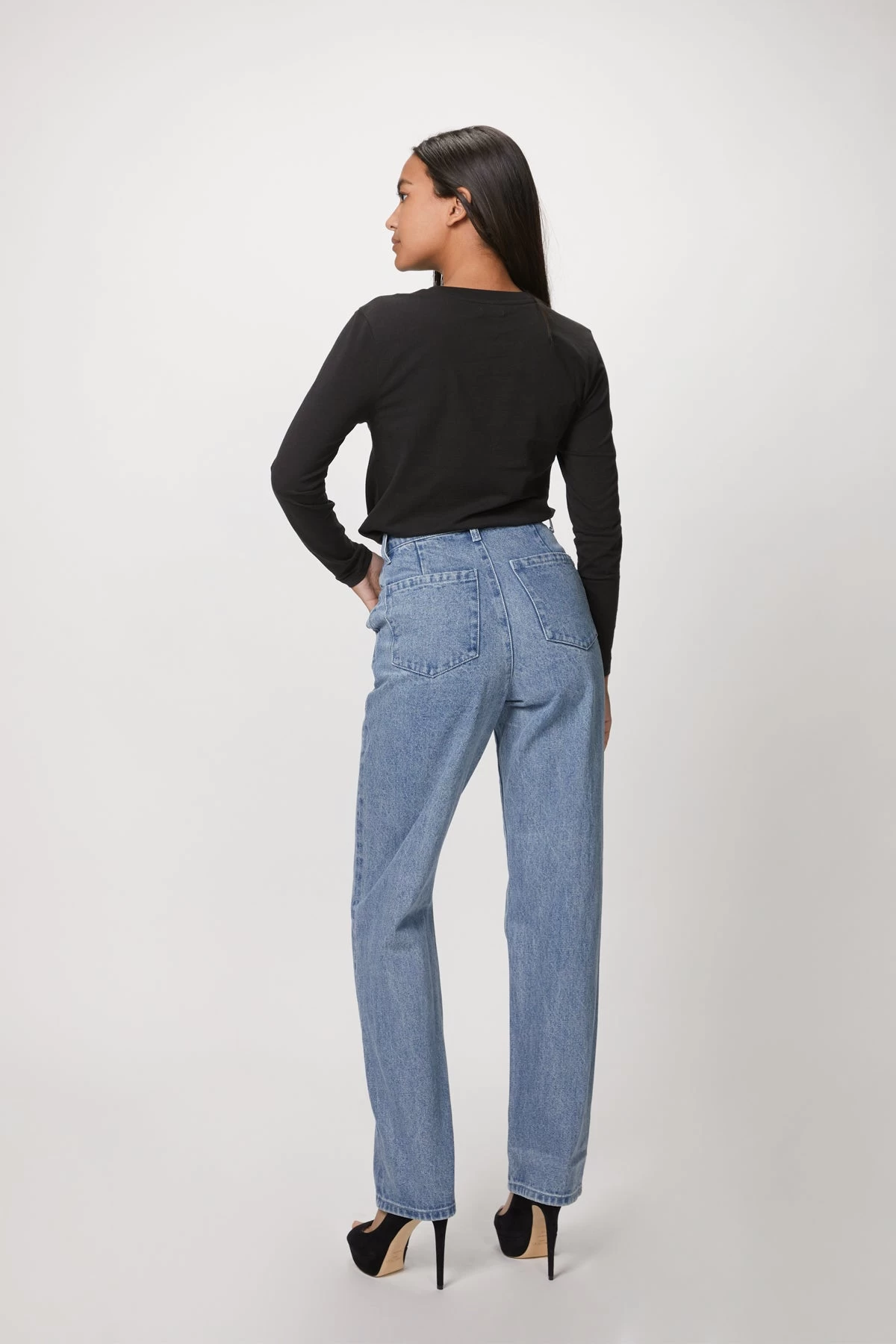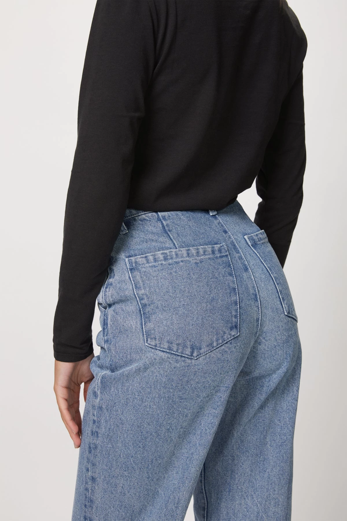 The Mom Jean is made from rigid cotton denim in a blue wash and has a relaxed silhouette. Â They are designed to sit high on the waist and have a flattering straight leg. Â They are slightly more refined that your favorite jeans due to the tailored fit and slit pockets. Â Pair with a rollneck or poplin shirt for a chic look.