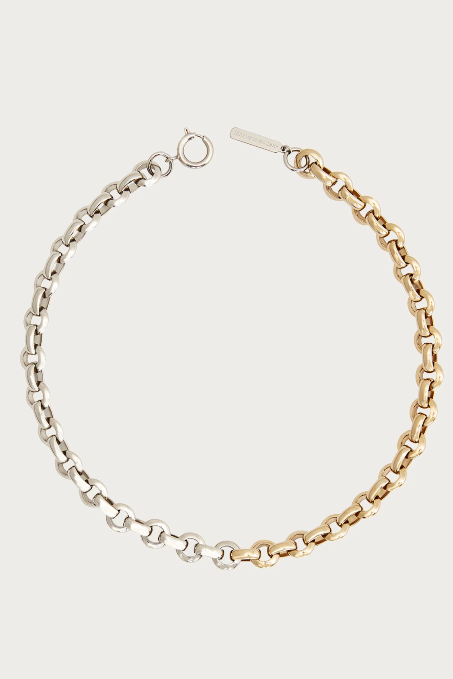 There’s no need to choose between gold or silver-toned accessories thanks to Justine Clenquet’s ‘Norma’ chunky chain choker. Handcrafted in the label’s French atelier, this eye-catching two-tone design has a close fit with a hook closure. Layer yours with other designs from the label to create a truly bespoke stack.