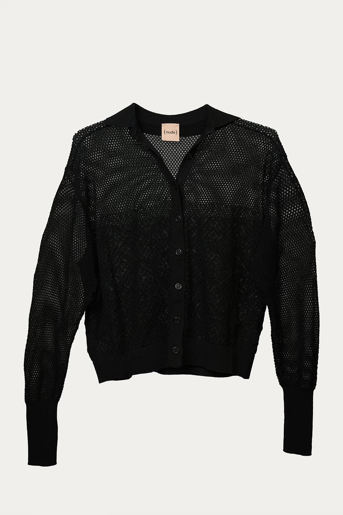 Let Nude curate your capsule wardrobe with versatile pieces such as this black open-knit top. Made from lightweight yarn, it has a button front and is cut to a relaxed silhouette that’s emphasized with dropped shoulders. Wear yours with a tonal bralette or camisole to temper the sheer design.