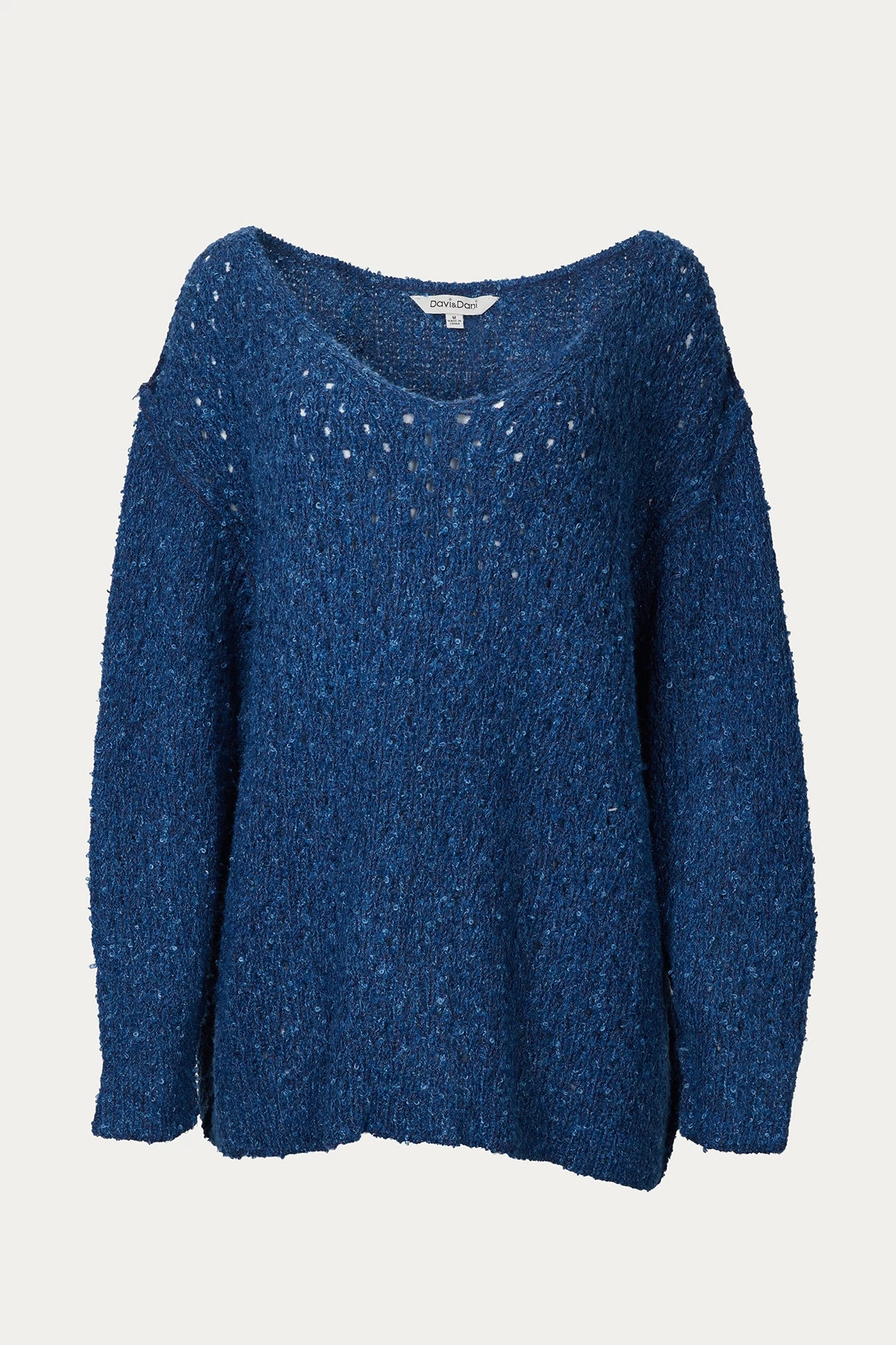 Made of textured peacock blue open-knit, J.NNA’s sweater is perfect to throw on after a day at the beach. Knit for an oversized fit, it has dropped shoulders that enhance the perfect slouch.Â