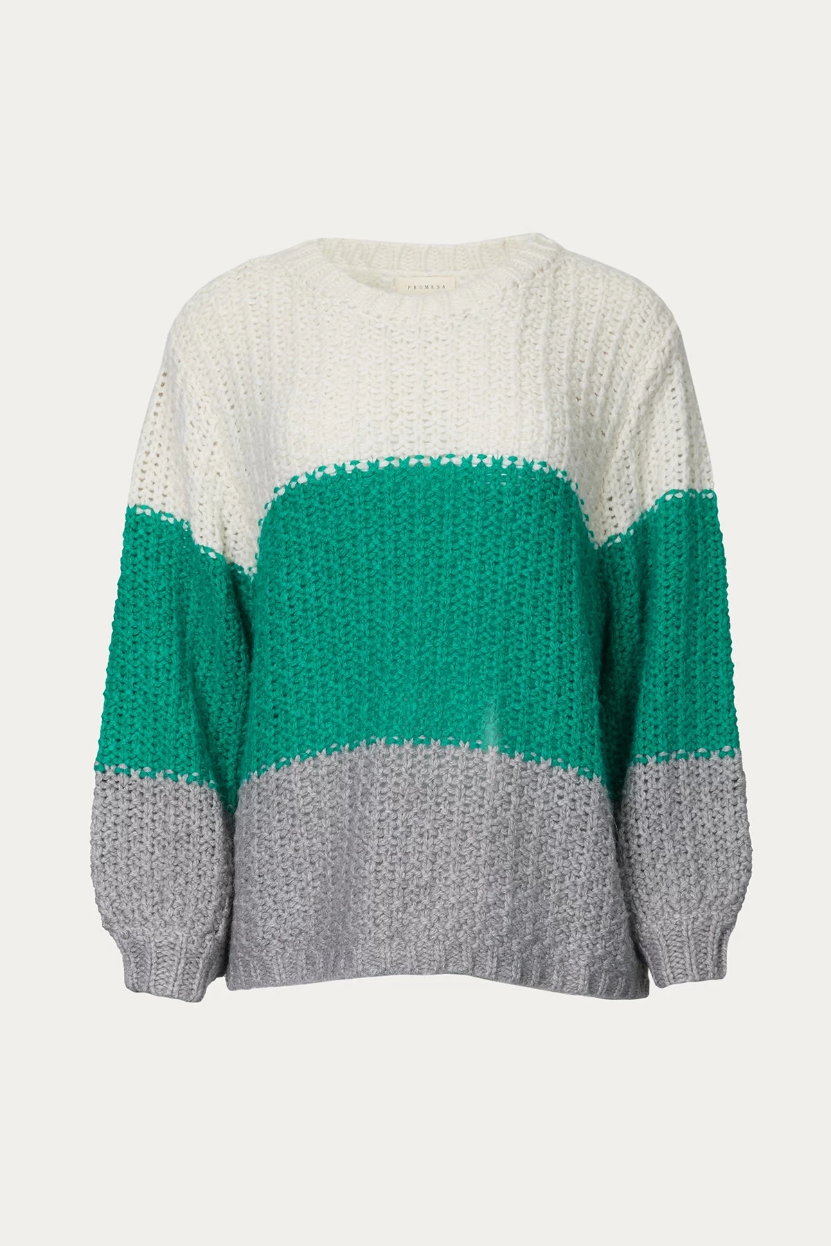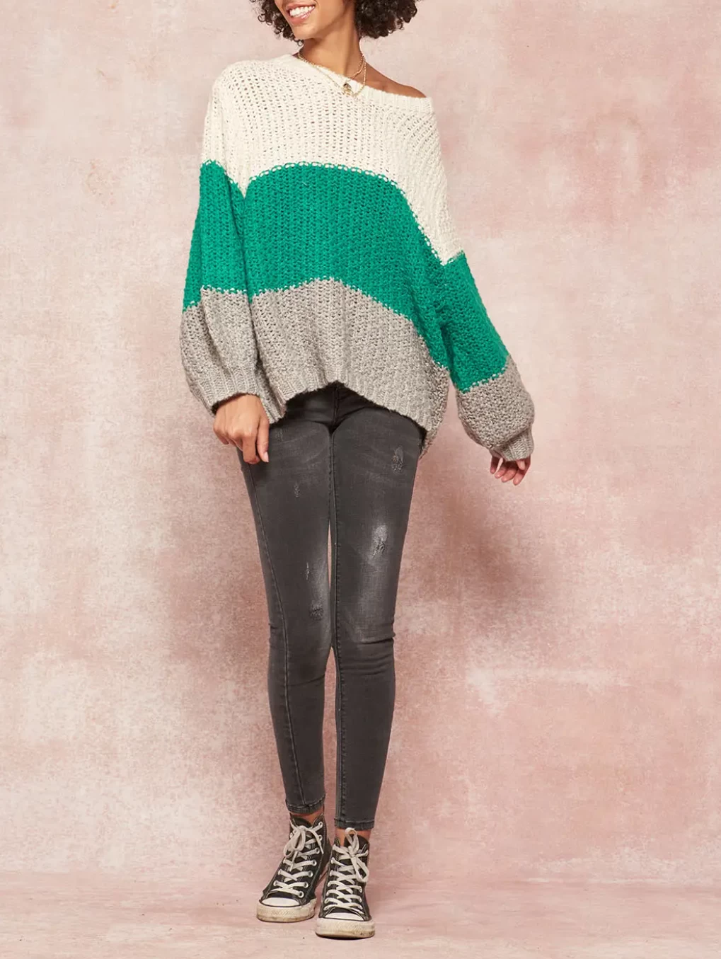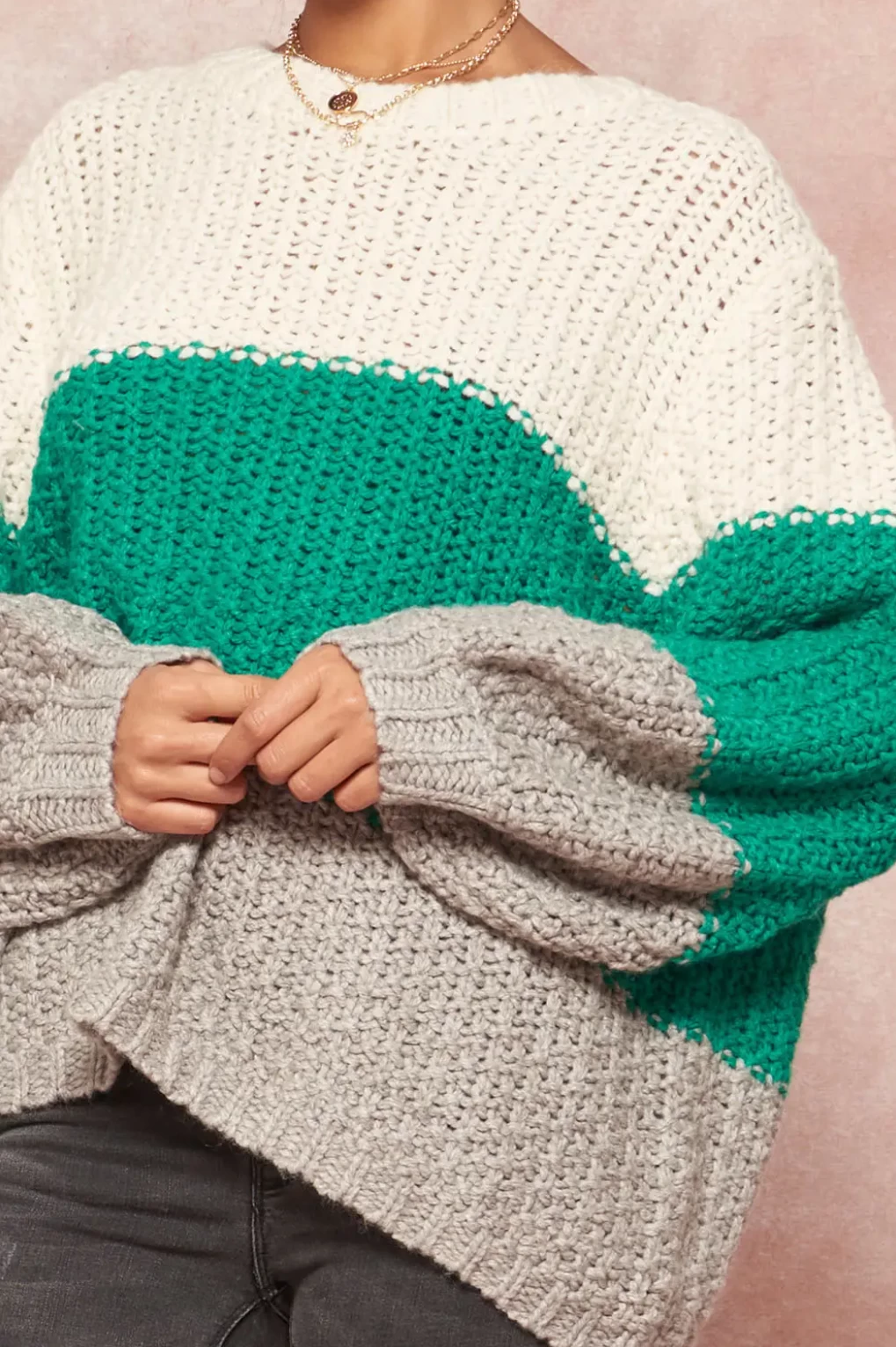 Sure to quickly become a treasured favorite, Promesa USA’s crochet knit sweater is colorblocked in grey, ivory and green hues. It features an oversized fit enhanced by dropped shoulders – creating a cozy, slouchy silhouette. Wear yours with leather pants and cropped jeans.