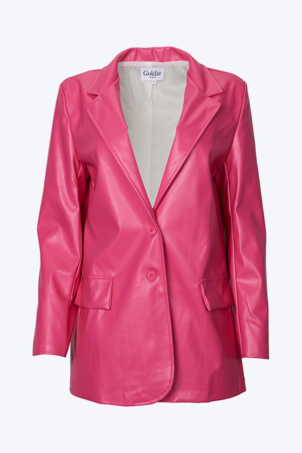 Goldie London’s designs are simple yet statement-making. Made of vegan leather, this blazer is tailored in a relaxed silhouette with notched lapels and decorative flap pockets at the front. Style yours with the matching pants in the same bold pink hue and mules.