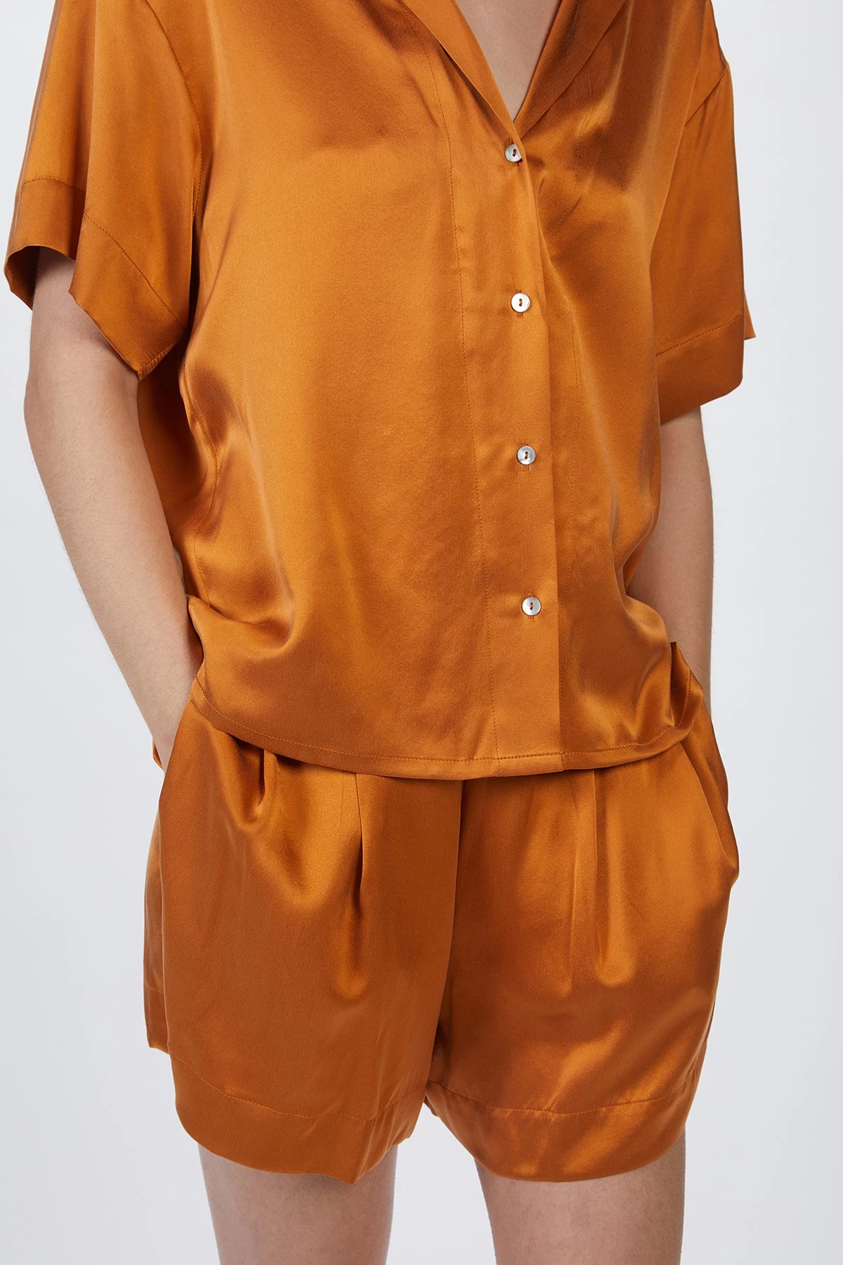 Crafted from luxury sandwashed silk-satin, Asceno’s ‘Prague’ shirt features an open Cuban collar and is cut for a relaxed, casual fit. Style it with the matching ‘Zurich’ shorts in the same ‘caramel’ hue to complete the set.
