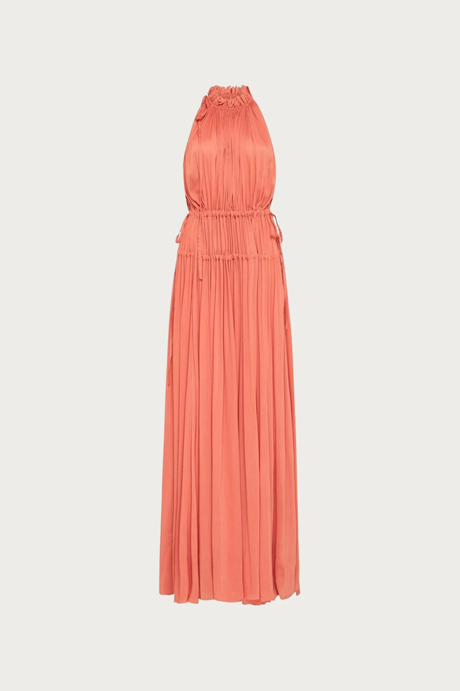 A head-turning piece that is uplighting and beautiful to wear, Bondi Born’s ‘Resplendent’ dress is made from seven meters of a Japanese silk blend that is incredibly lightweight and provides a magical drape. It is designed to sit high on the neck, cuts away at the shoulders and falls dramatically to the floor via a two tier design feature, each accented by rouleau ties.Â