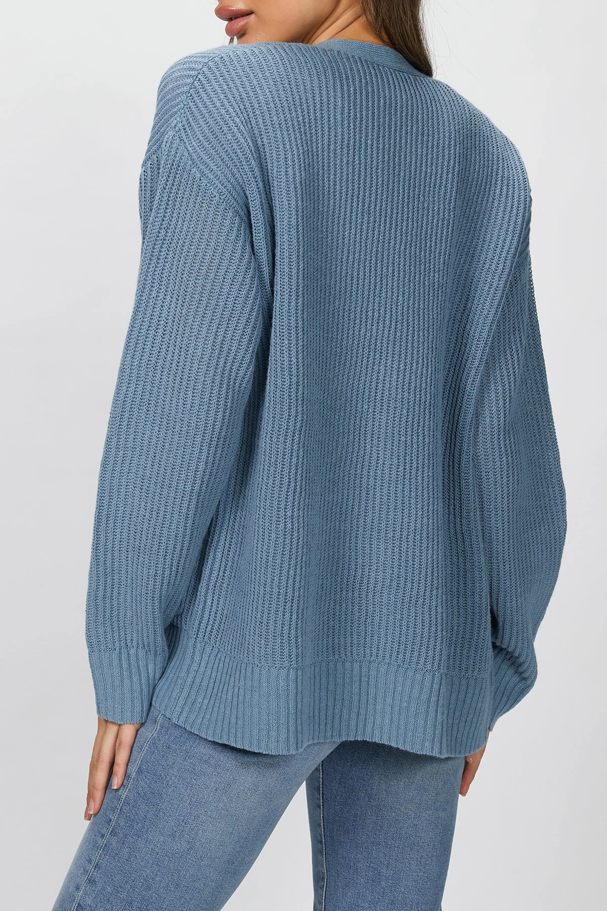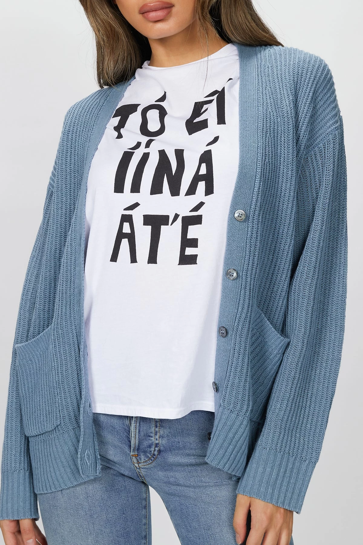 Tap 6397’s nonchalant-yet-elevated approach to off-duty dressing with the blue ribbed ‘Kurt’ cardigan. Knitted from ultra-soft recycled linen yarn, it’s shaped to an oversized, V-neck silhouette with front patch pockets. Style it with a tonal bralette and jeans.Â